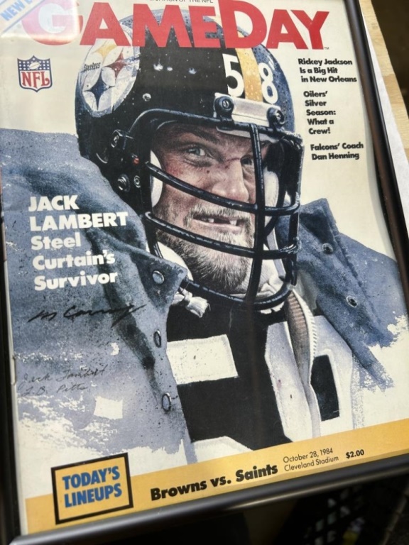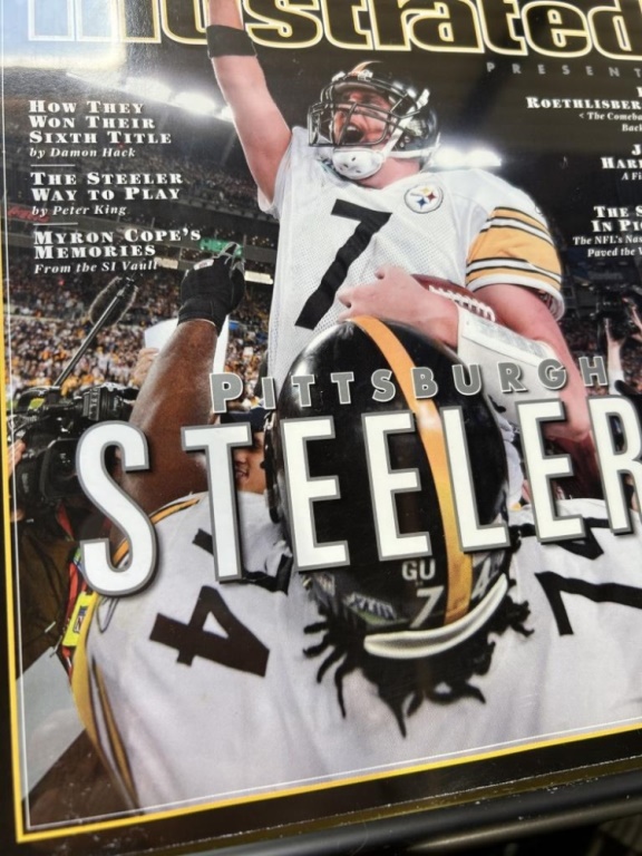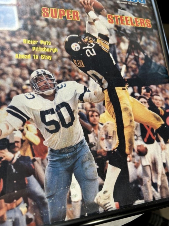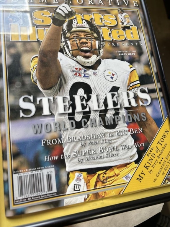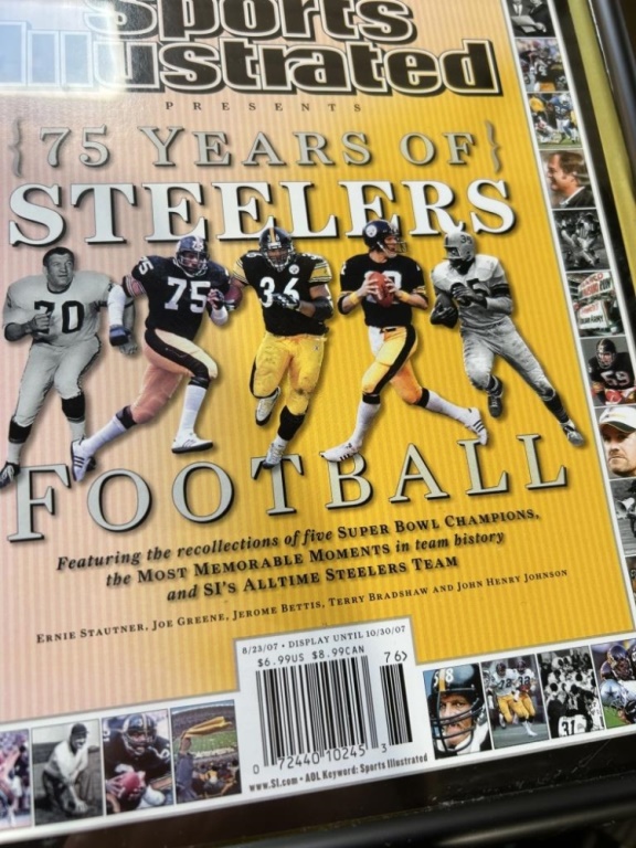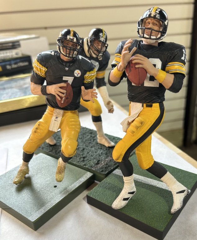 5 STEELERS MAGAZINE COVERS AND 3 FIGURINES OF TERRY BRADSHAW BIG BEN AND JACK LAMBERT