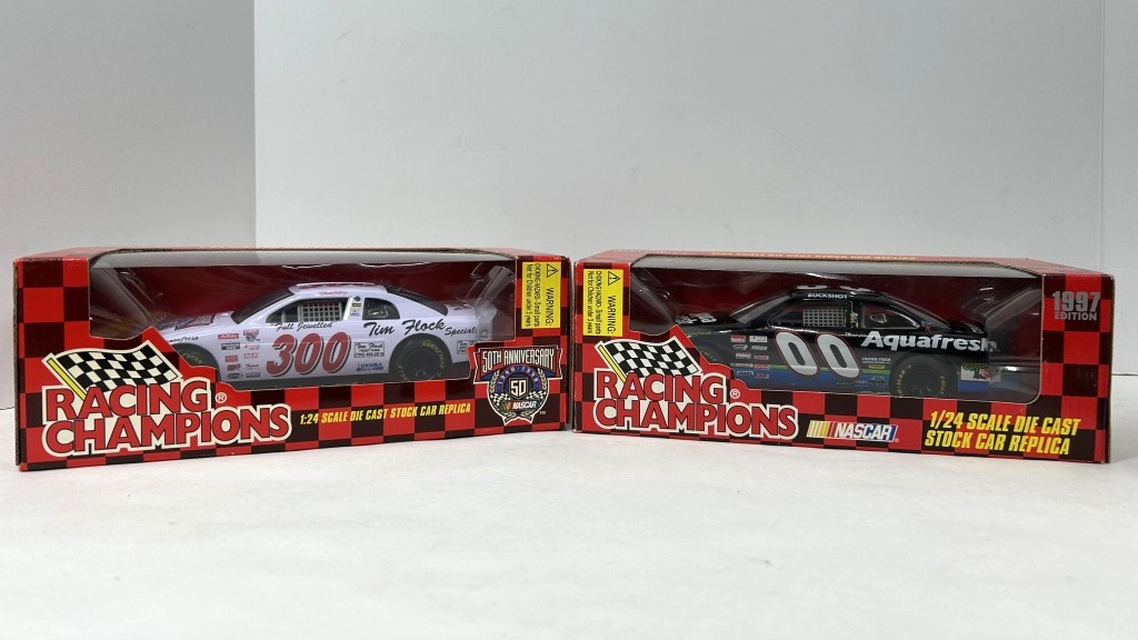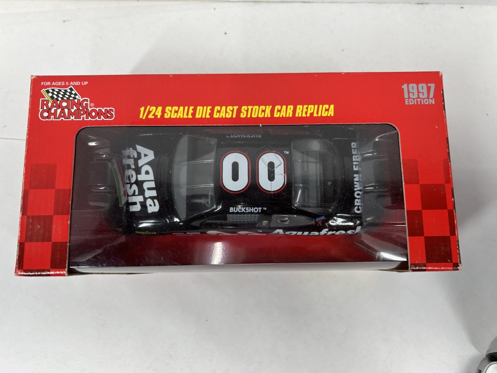 NOS 1/24 RACING CHAMPIONS 50TH ANNIVERSARY TIM FLOCK #300 TRIBUTE DIECAST SN:F905 AND NOS 1/24 1997 RACING CHAMPIONS BUCKSHOT JONES #00 AQUAFRESH DIECAST SN:A827
