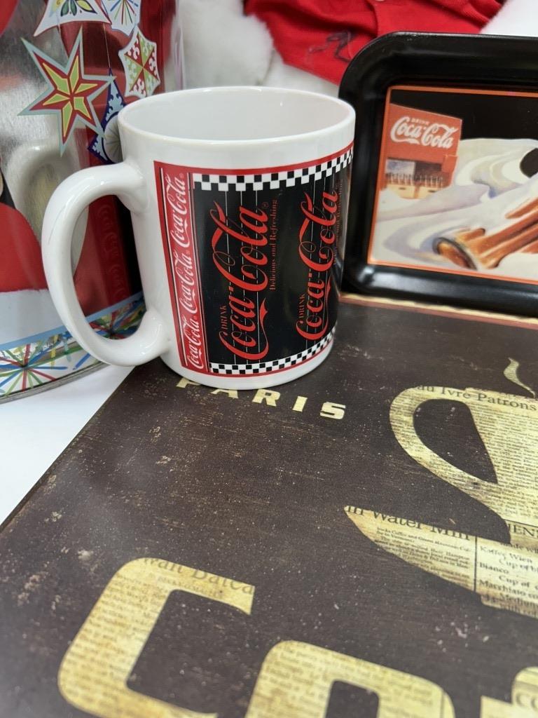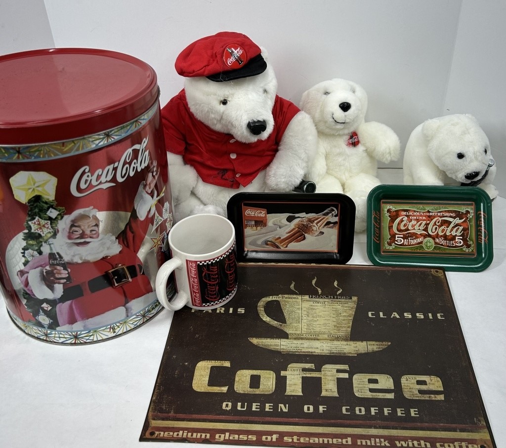 COCA COLA POPCORN TIN, BEARS,COCA COLA COFFEE MUG, COFFEE SIGN