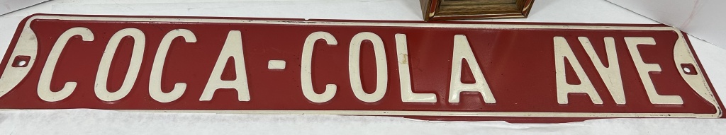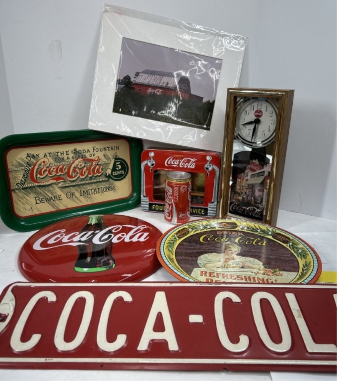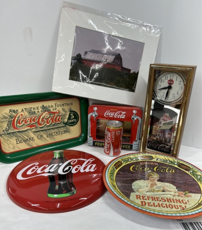 COCA COLA AVENUE SIGN AND COCA COLA CLOCK AS WELL AS COLLECTIBLE SERVING TRAYS AND COCA COLA BARN PICTURE