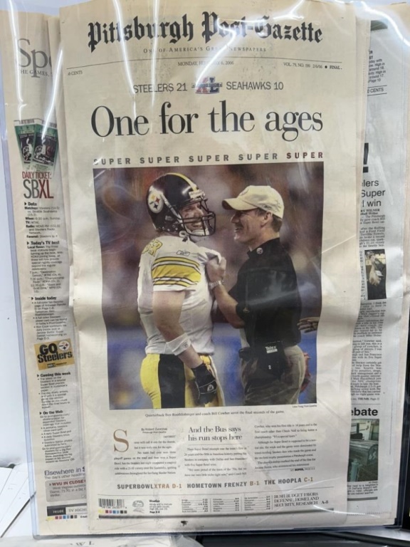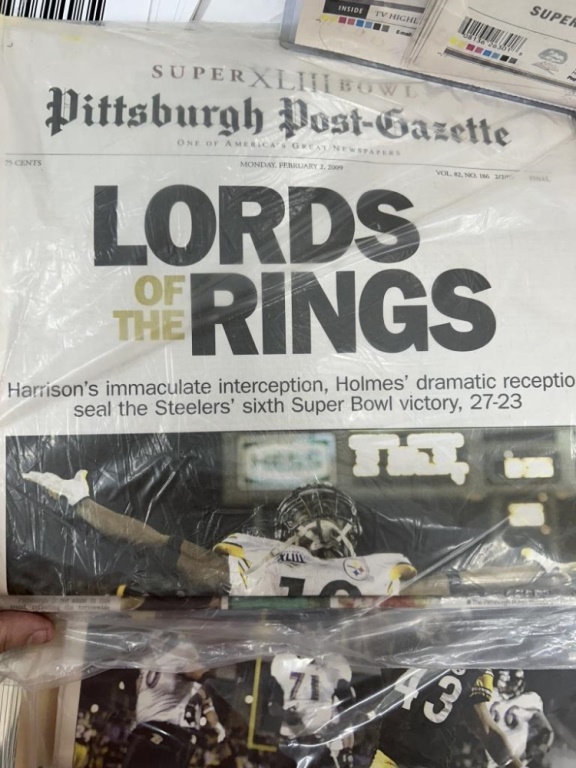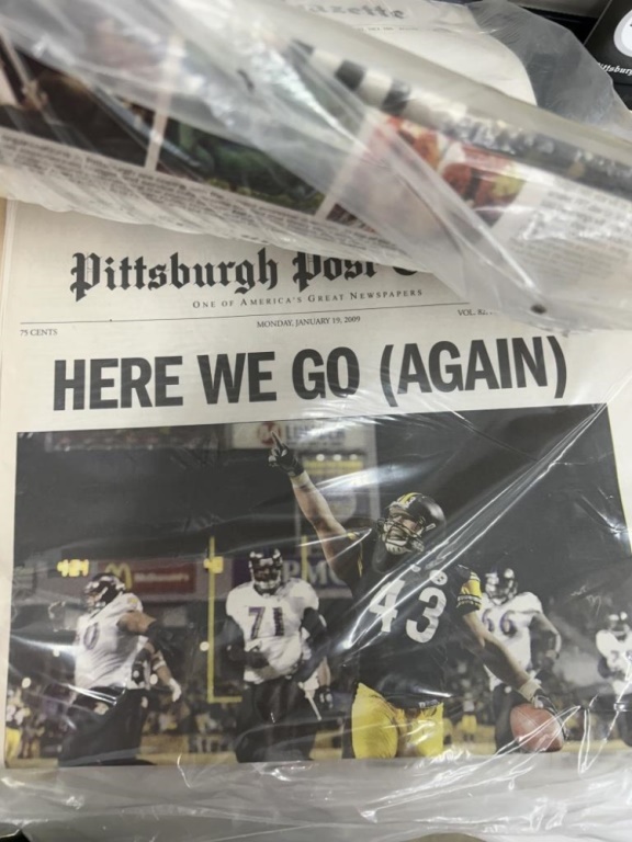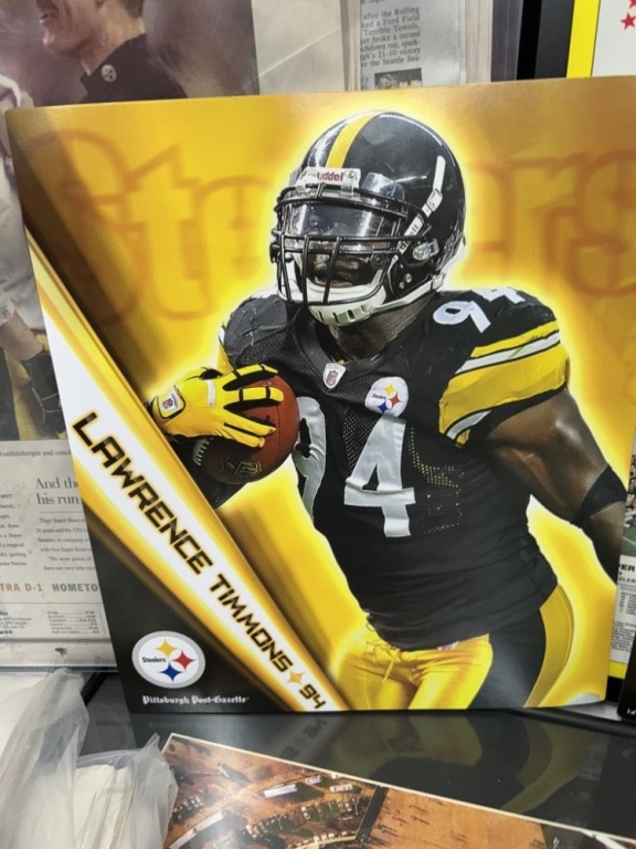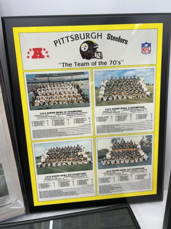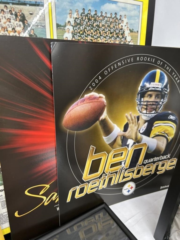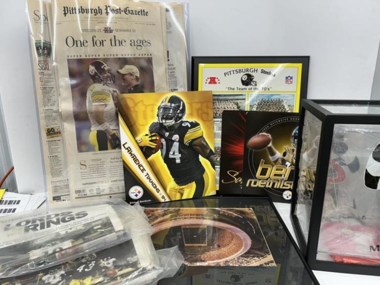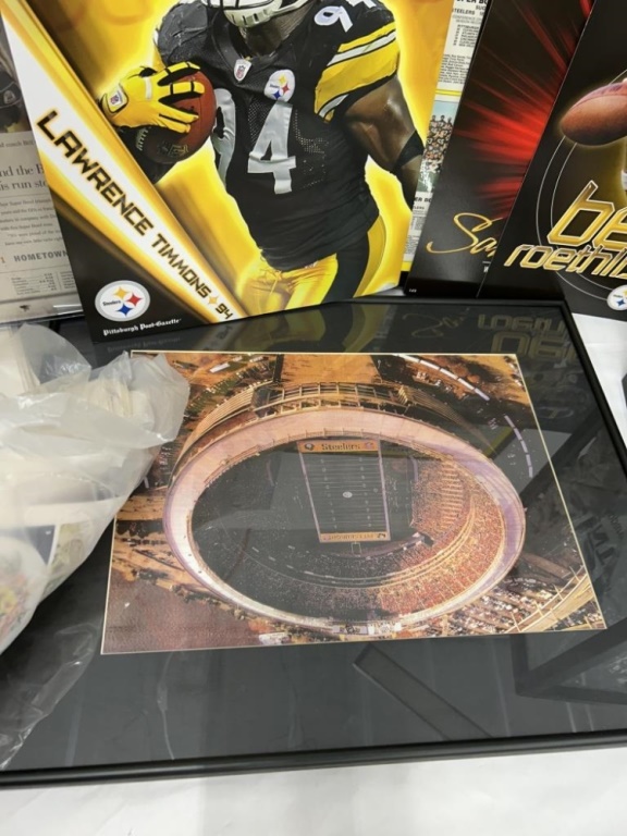 LOT OF STEELERS ARTICLES, POSTERS, PICTURES AND FOOTBALL SHADOWBOX