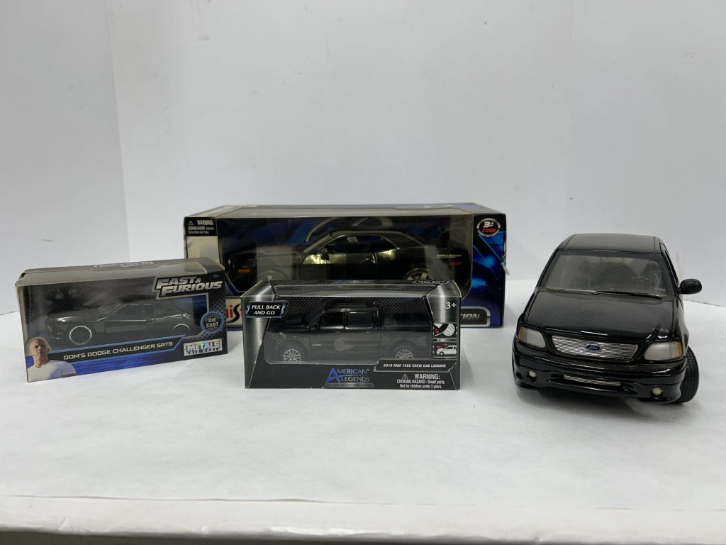 NOS DIE CAST FAST AND FURIOUS DOM’S CHALLENGER SRT8, DIE CAST 2019 RAM 1500 LARAMIE, NOS 1/18 DIE CAST DODGE CHALLENGER, FORD HARLEY DAVIDSON TRUCK