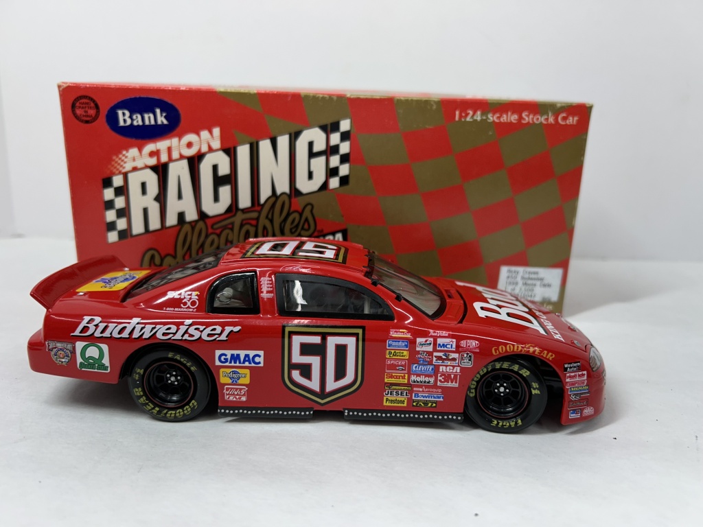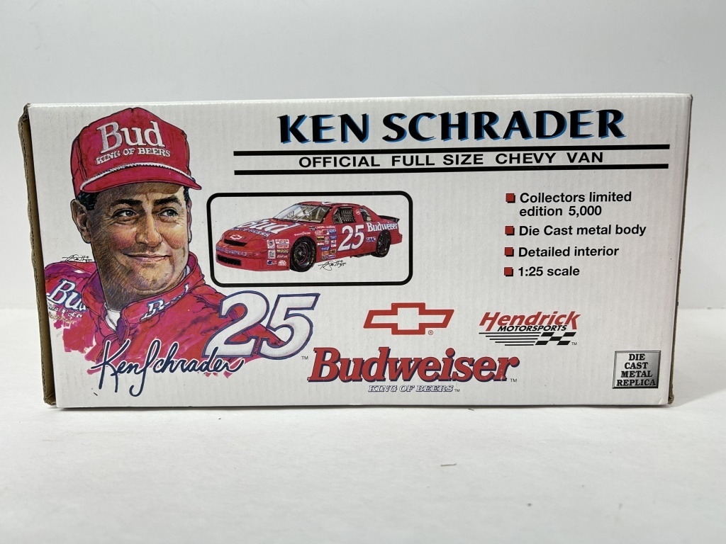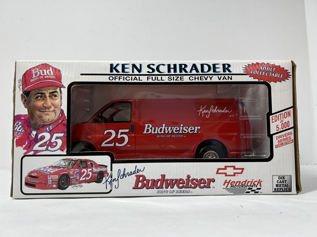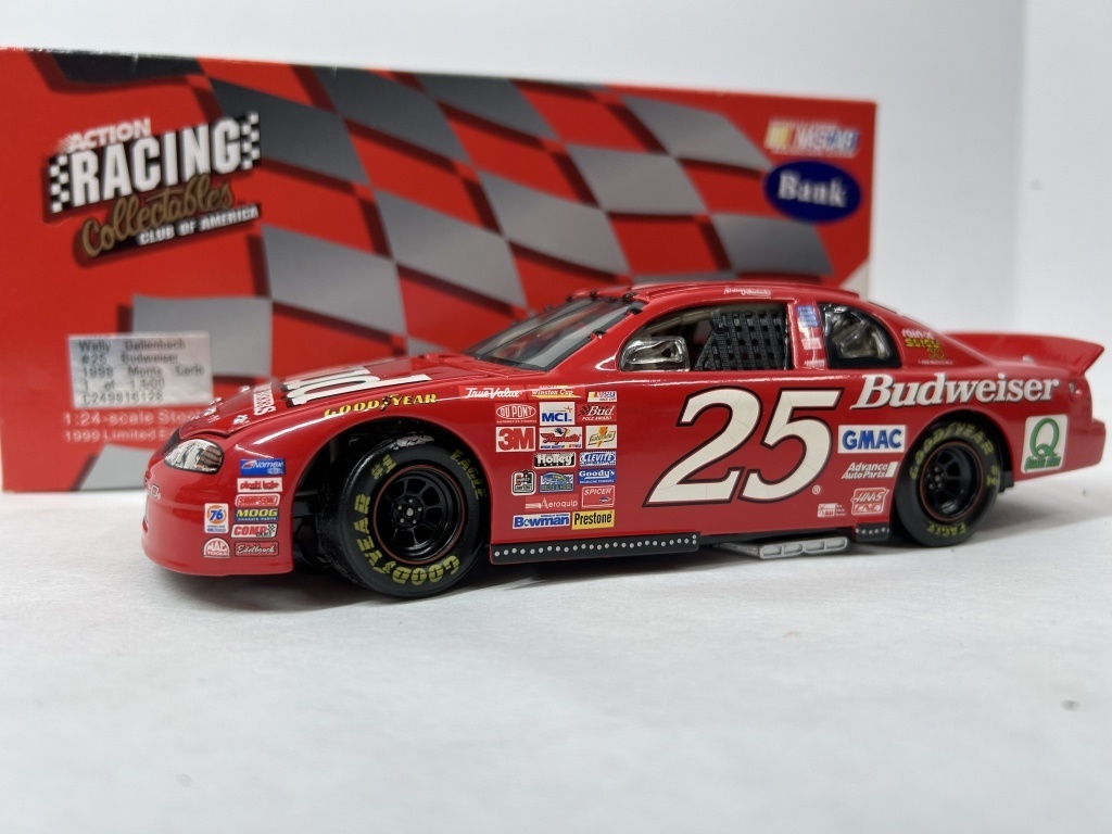 NOS 1/24 RICKY CRAVEN #50 BUDWEISER 1998 MONTE CARLO 1 OF 2,500 CAR BANK, NOS 1/24 WALLY DALLENBACK #25 BUDWEISER 1999 MONTE CARLO 1 OF 1,500 CAR BANK, NOS 1/25 DIE CAST FULL SIZE CHEVY VAN 1 OF 5,000