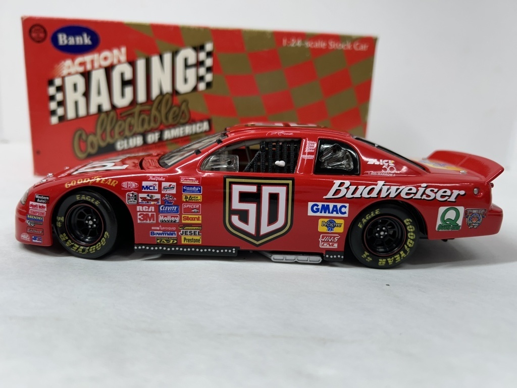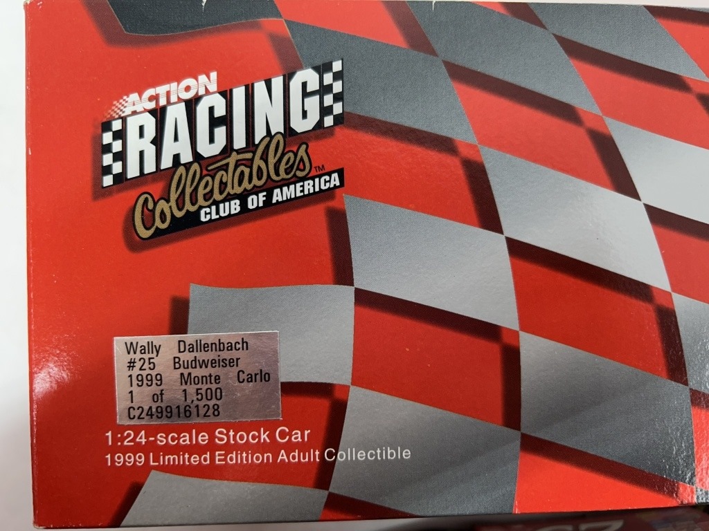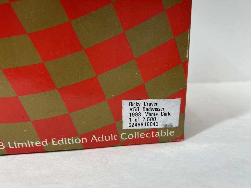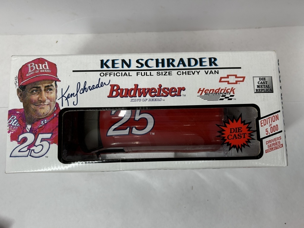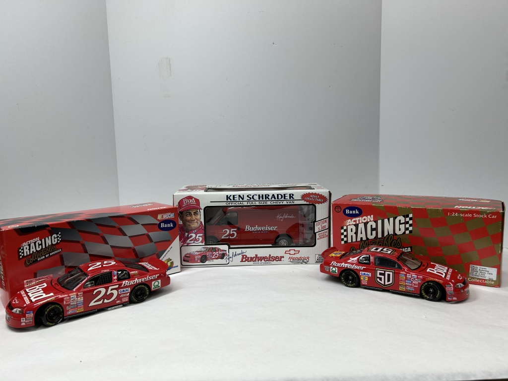 NOS 1/24 RICKY CRAVEN #50 BUDWEISER 1998 MONTE CARLO 1 OF 2,500 CAR BANK, NOS 1/24 WALLY DALLENBACK #25 BUDWEISER 1999 MONTE CARLO 1 OF 1,500 CAR BANK, NOS 1/25 DIE CAST FULL SIZE CHEVY VAN 1 OF 5,000