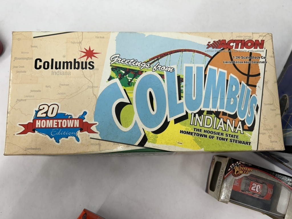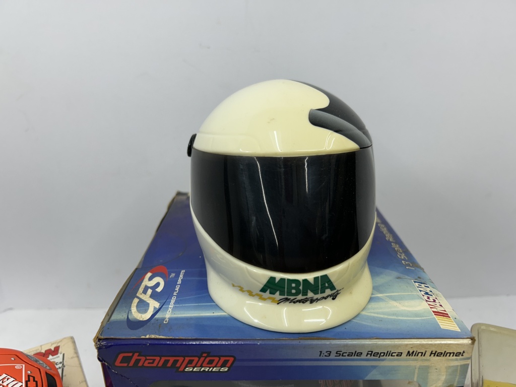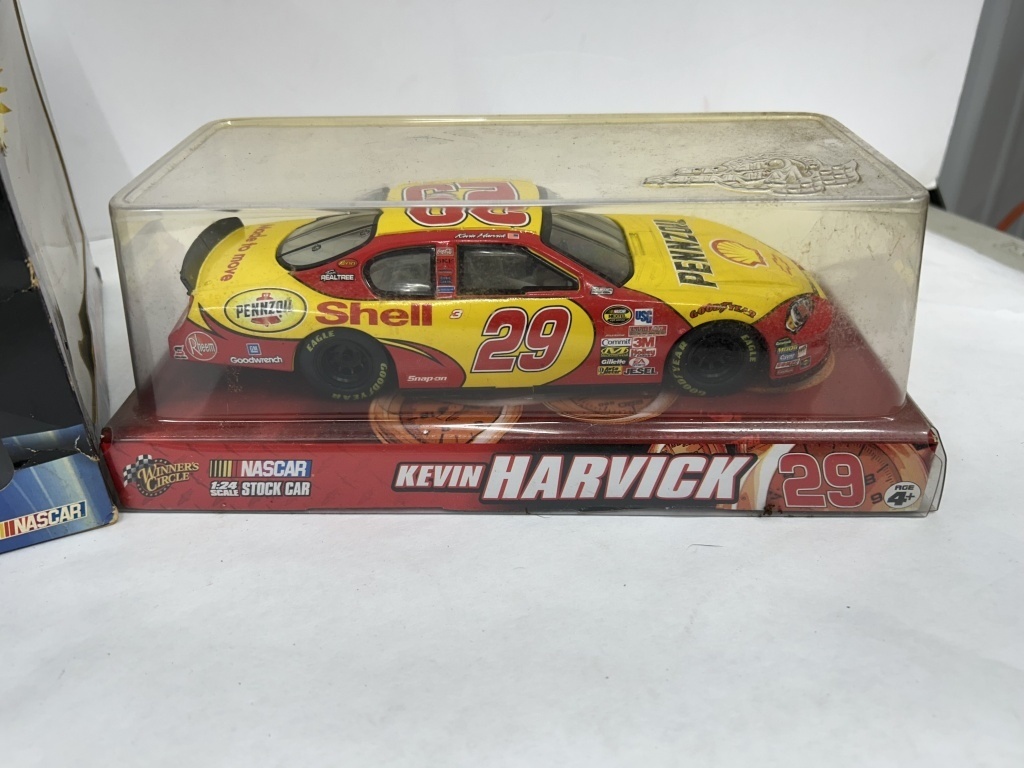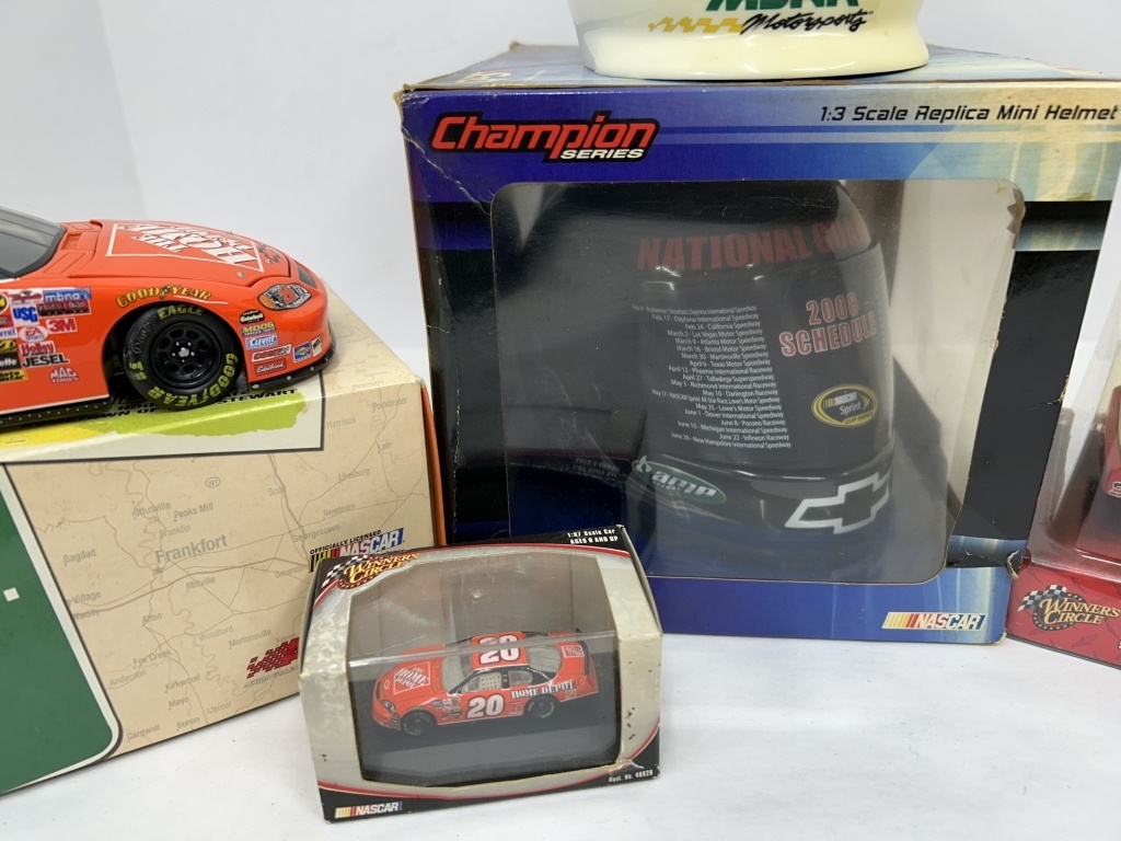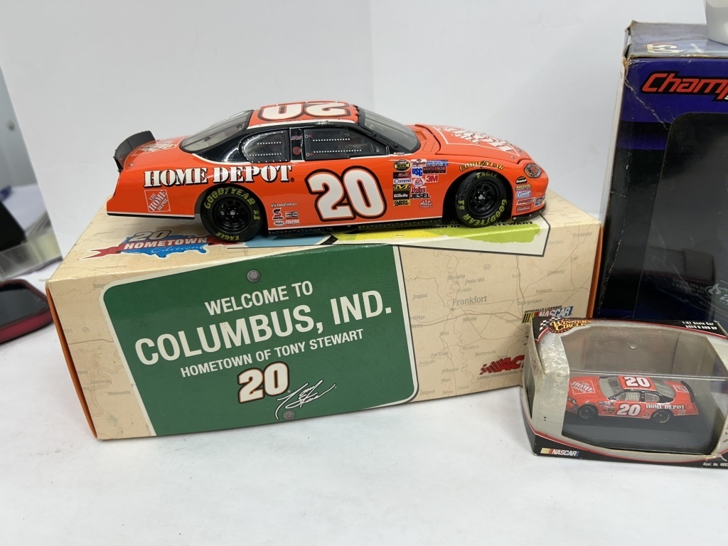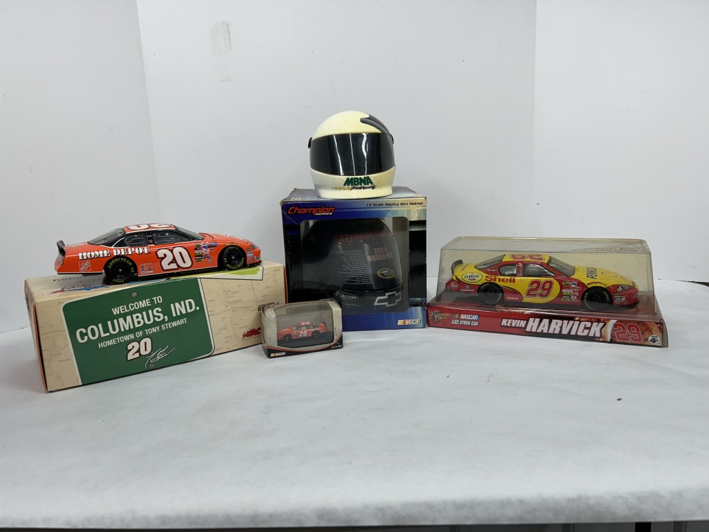 NOS 1/24 TONY STEWART #20 HOME DEPOT HOMETOWN EDITION 2005 MONTE CARLO LIMITED EDITION, LOT ALSO INCLUDES NOS 1/24 WINNER’S CIRCLE KEVIN HARVICK #29 SHELL STOCK CAR, 2 MINIATURE HELMETS, AND 1/64 TONY STEWART HOME DEPOT STOCK CAR