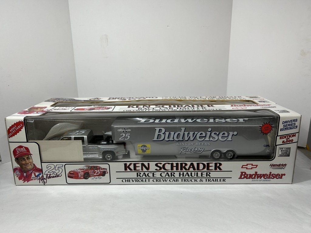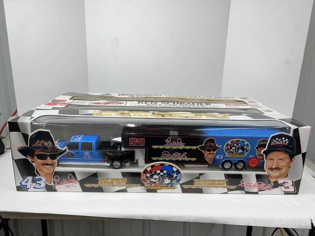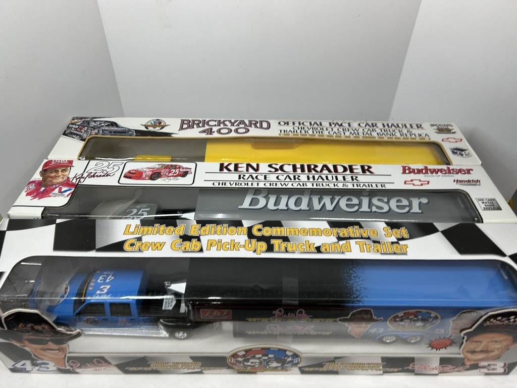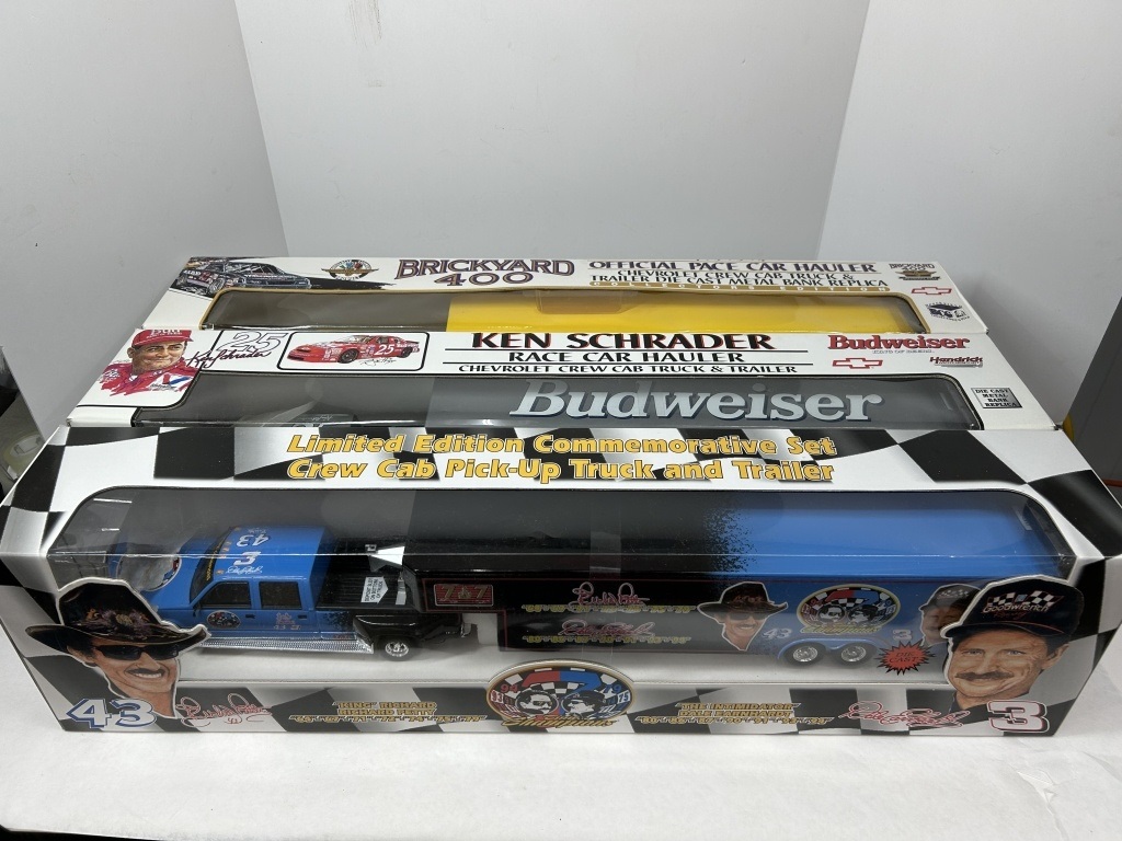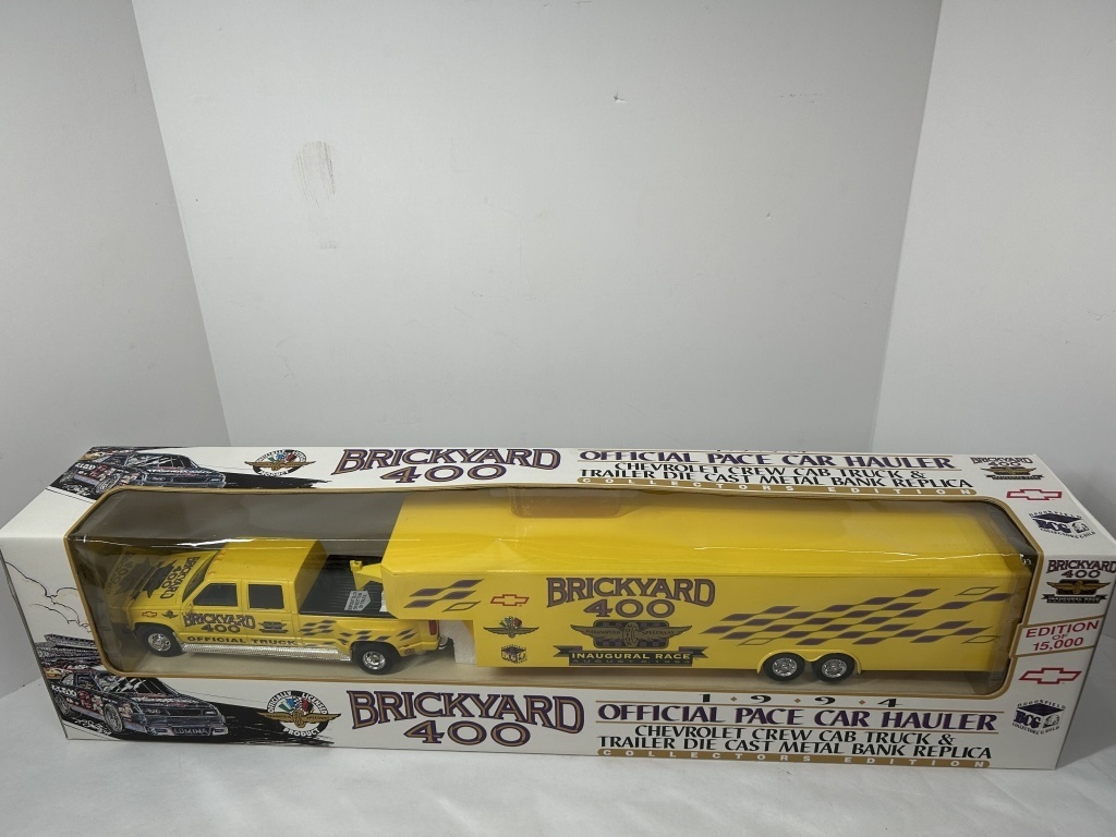 RICHARD PETTY/ DALE EARNHARDT LIMITED EDITION PICK UP TRUCK AND TRAILER SET, KEN SCHRADER RACE CAR HAULER, BRICKYARD 400 1994 OFFICIAL PACE CAR HAULER BANK