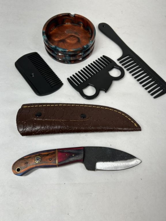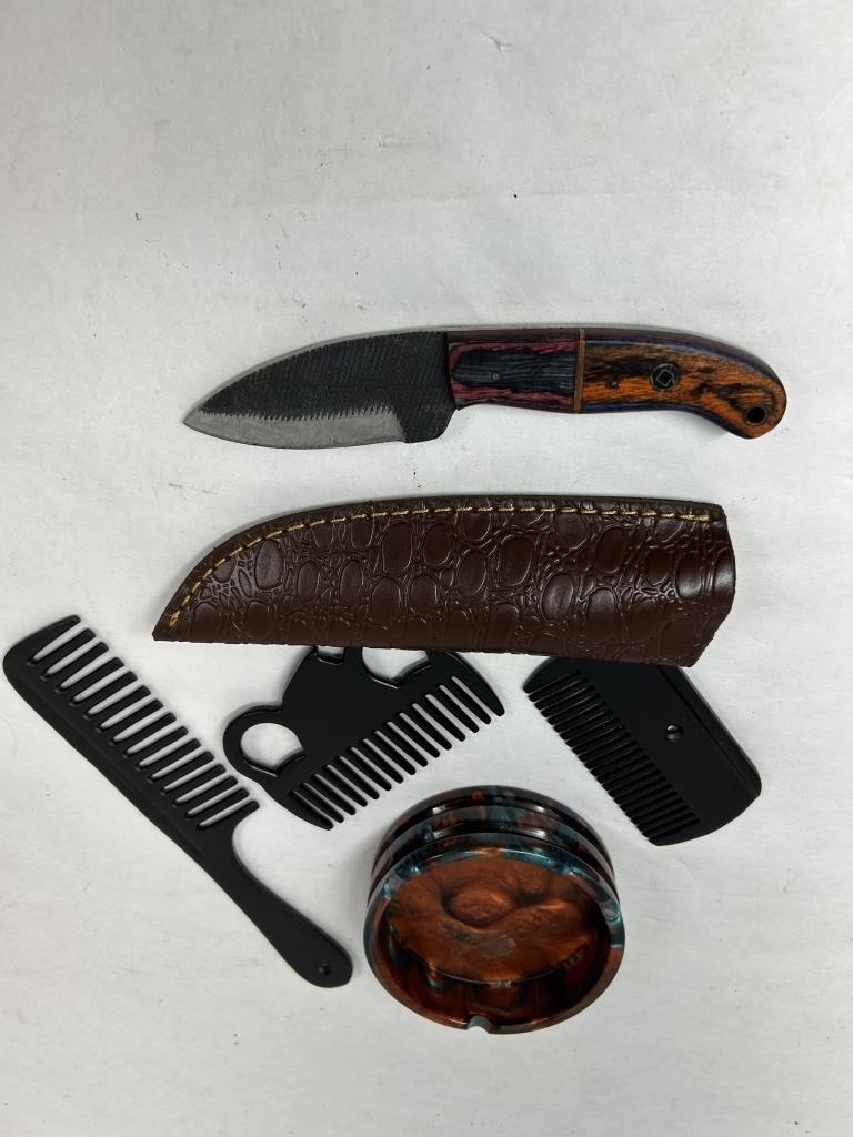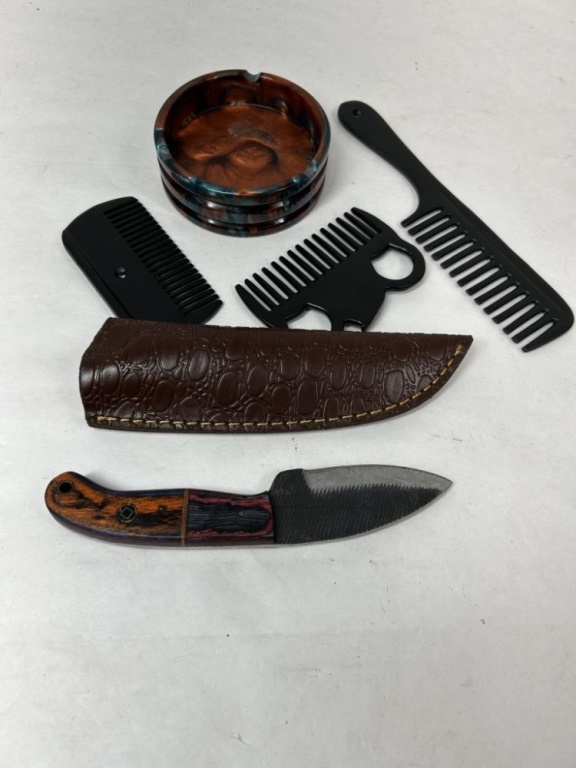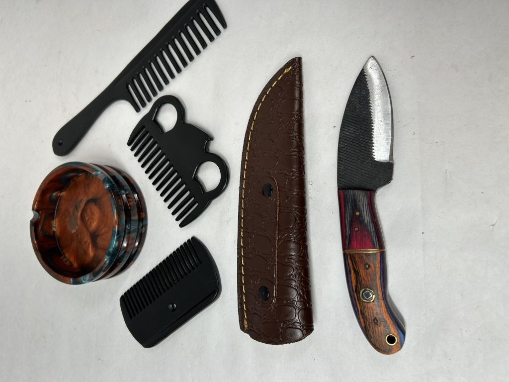 DEMASCUS HAND FORGED KNIFE 2 3/4″ BLADE WITH SHEATH, ASH TRAY AND COMBS