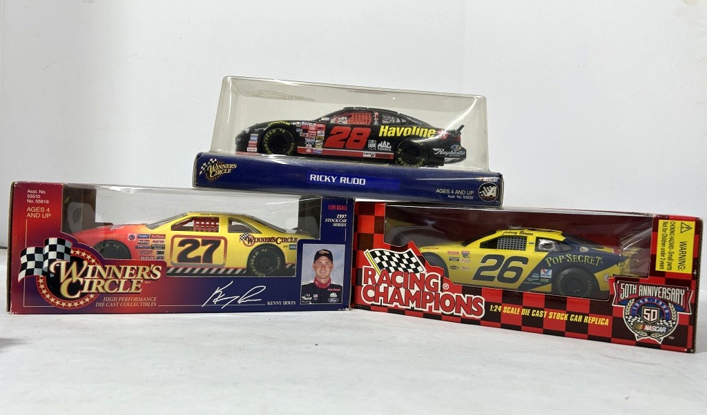 NOS 1/24 JOHNNY BENSON #26 CHEERIOS DIECAST STOCK CAR SN:F327, NOS 1/24 WINNERS CIRCLE KENNY IRWIN #27 TONKA DIECAST STOCK CAR, NOS 1/24 KENNY IRWIN #28 HAVOLINE DIECAST STOCK CAR