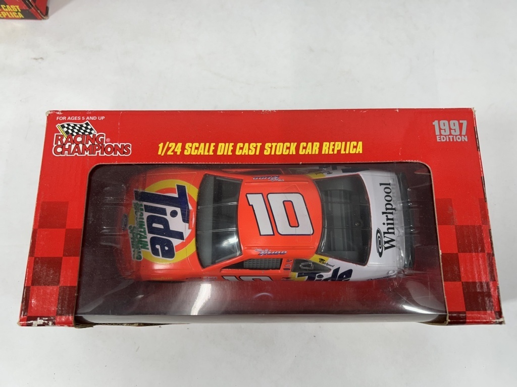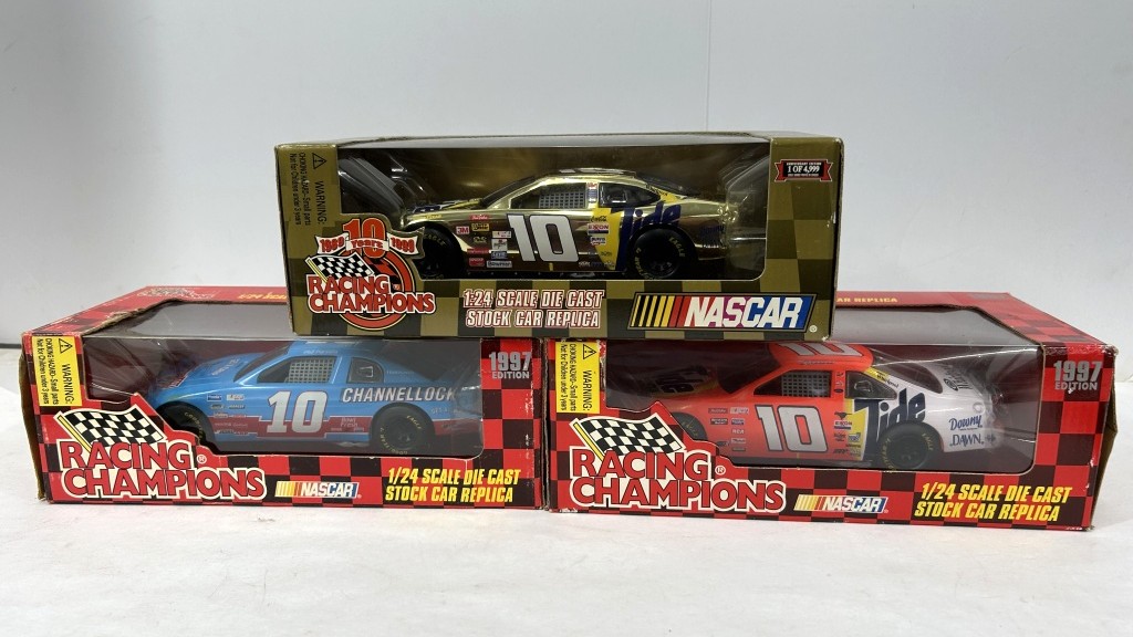 NOS 1/24 RICKY RUDD 1999 RACING CHAMPIONS NASCAR GOLD COMMEMORATIVE SERIES DIECAST 1 OF 4,999 SN:FN03, NOS 1/24 RACING CHAMPIONS RICKY RUDD #10 TIDE THUNDERBIRD DIECAST SN:C827, NOS 1/24 RACING CHAMPIONS PHIL PARSONS #10 CHANNELLOCK MONTE CARLO DIE CAST SN:A714