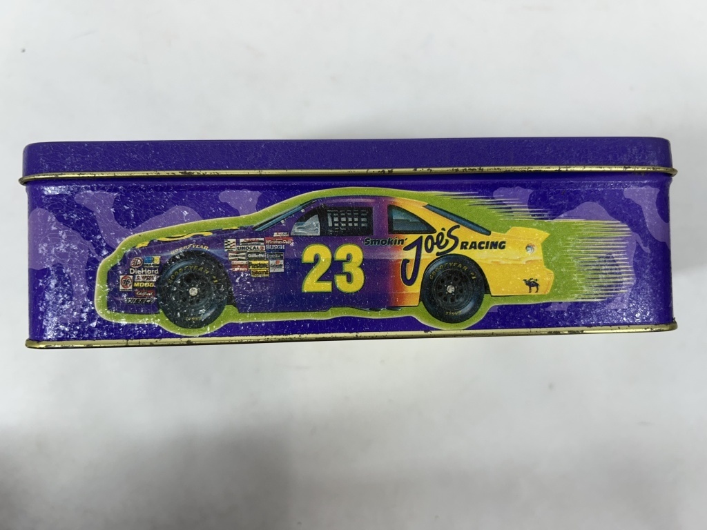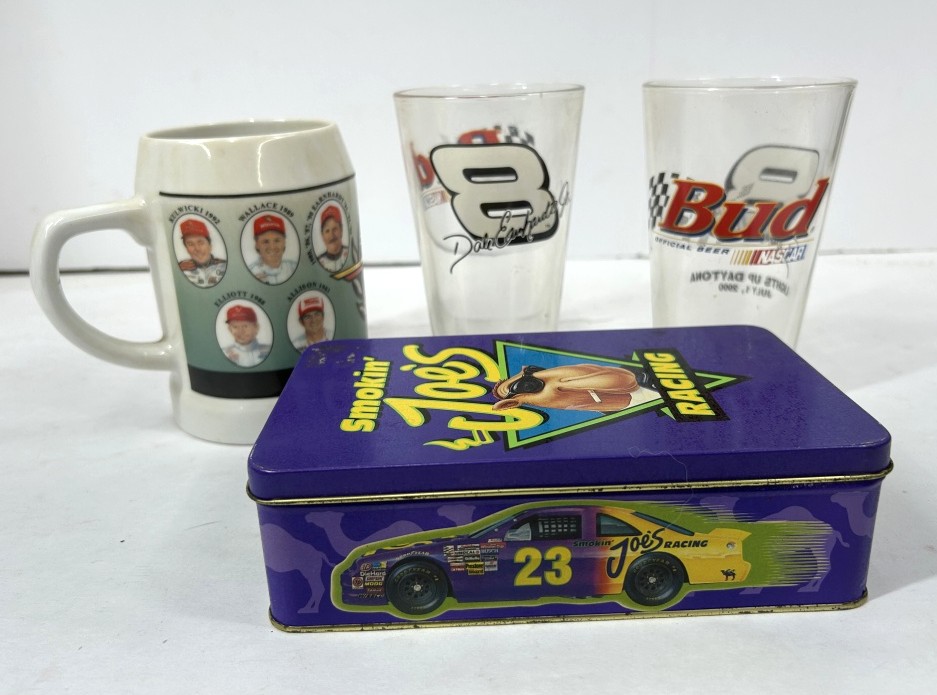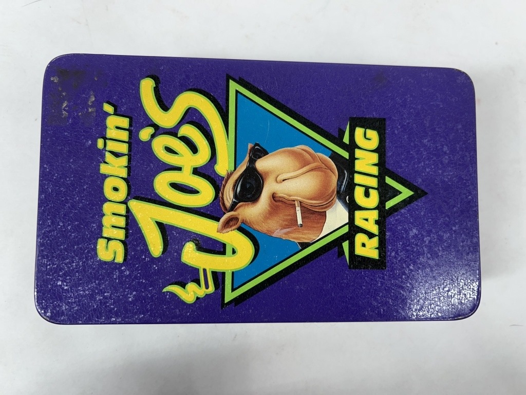 SMOKING JOES RACING TIN BOX AND BUDWEISER GLASSES