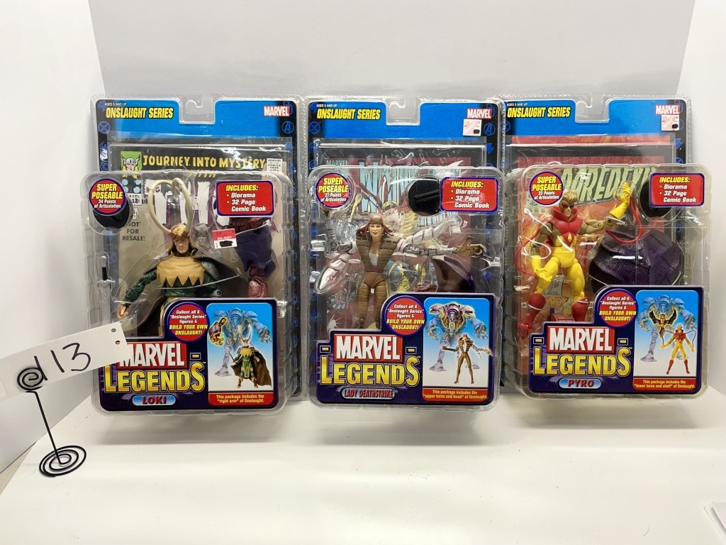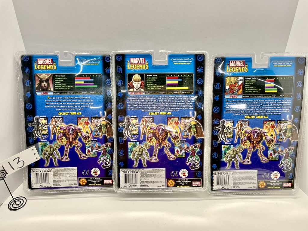 MARVEL LEGEND’S- LOKI – INCLDS, THE RIGHT ARM OF ONLSAUGHT- LADY DEATHSTRIKE – INCLDS UPPER TORSO & HEAD OF ONSLAUGHT – PYRO- LOWER TORSO & SHELL OF ONSLAUGHT- NIB- SHOWS SOME WEAR AND TEAR FROM STROAGE