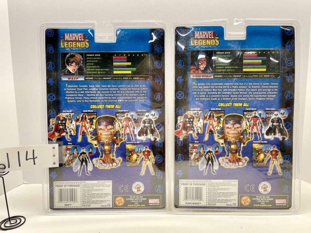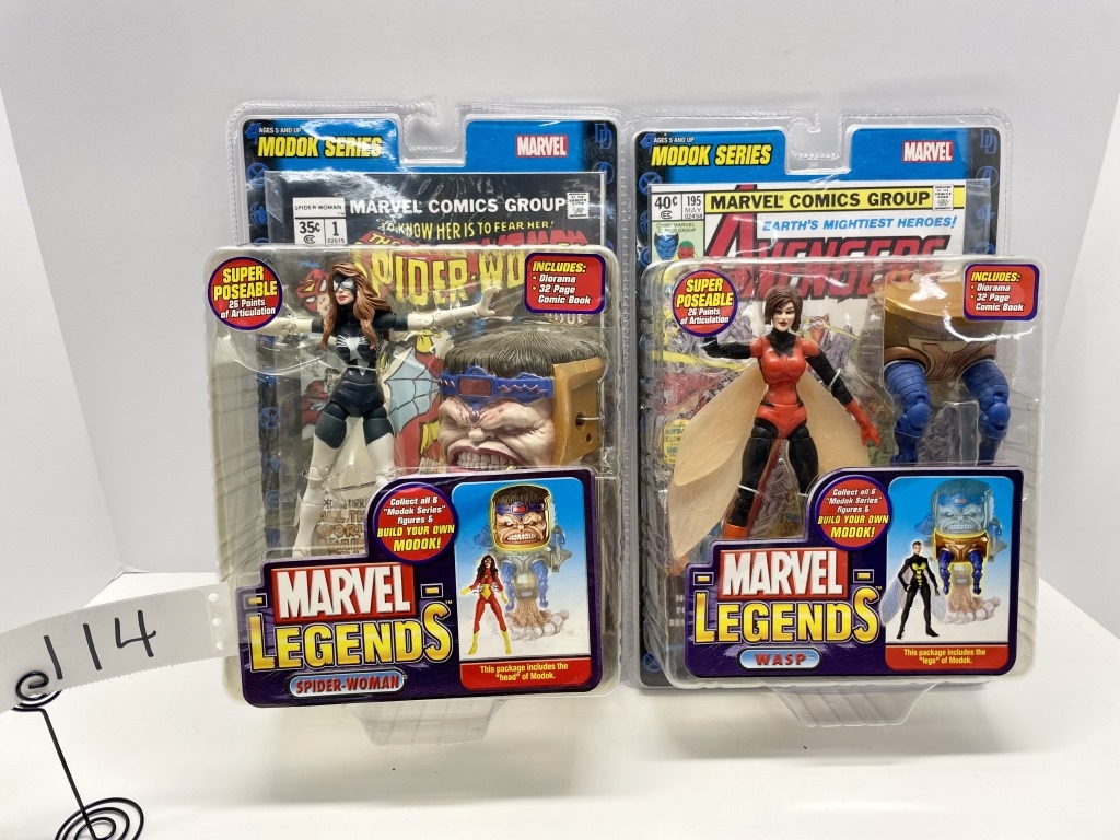 MARVEL LEGENDS – WASP INCLDS, LEGS OF MODOK – SPIDER WOMAN – INCLDS HEAD OF MODOK. EACH COME WITH 32 PG COMIC BOOK AND DIORAMA – NIB- SHOWS SOME WEAR & TEAR FROM STORAGE