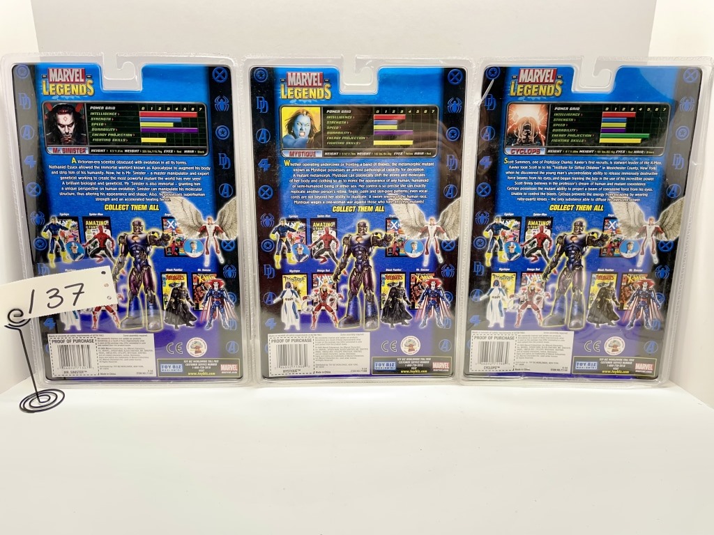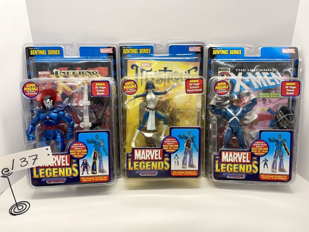 MR SINISTER- HAS RIGHT LEG OF SENTINEL – MYSTIQUE- HAS LOWER TORSO OF SENTINEL- CYCLOPS- HAS LEFT ARM OF SENTINEL- EACH HAS COMIC BOOK- NIB- SHOWS SOME WEAR AND TEAR FROM STORAGE
