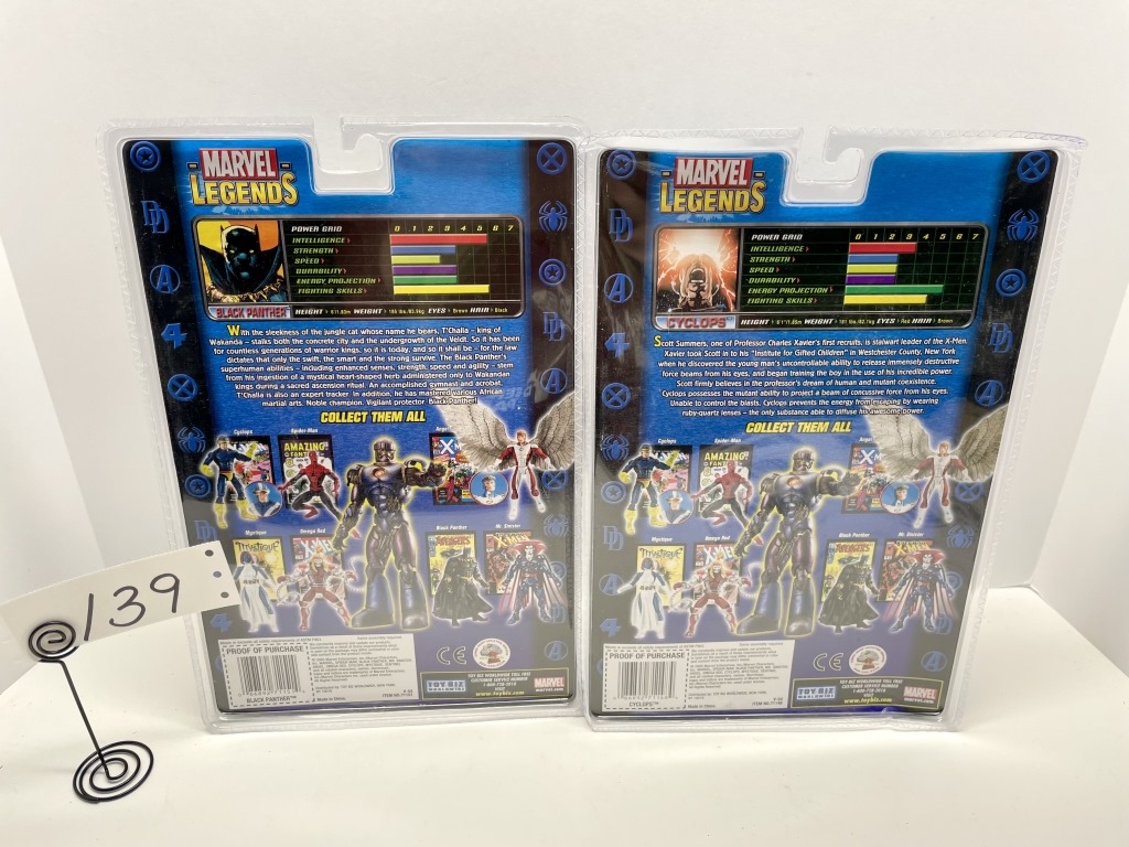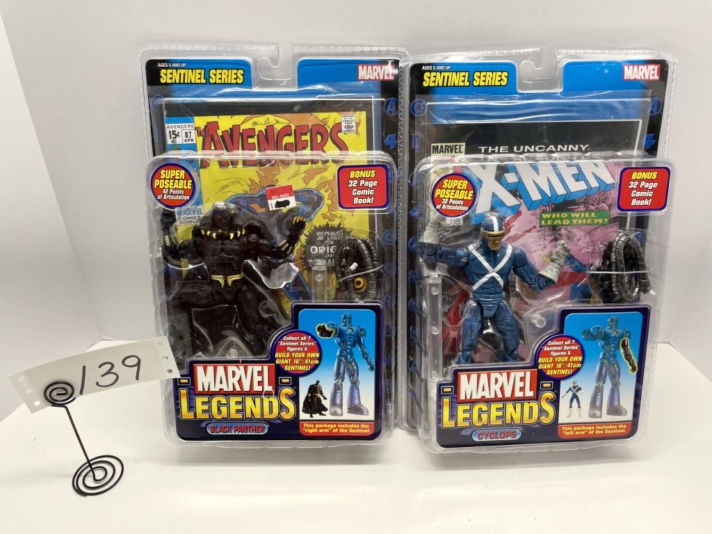 BLACK PANTHER – HAS RIGHT ARM OF SENTINEL- CYCLOPS HAS LEFT ARM OF SENTINEL- BOTH HAVE COMIC BOOKS – NIB- SHOWS SOME WEAR AND TEAR FROM STORAGE