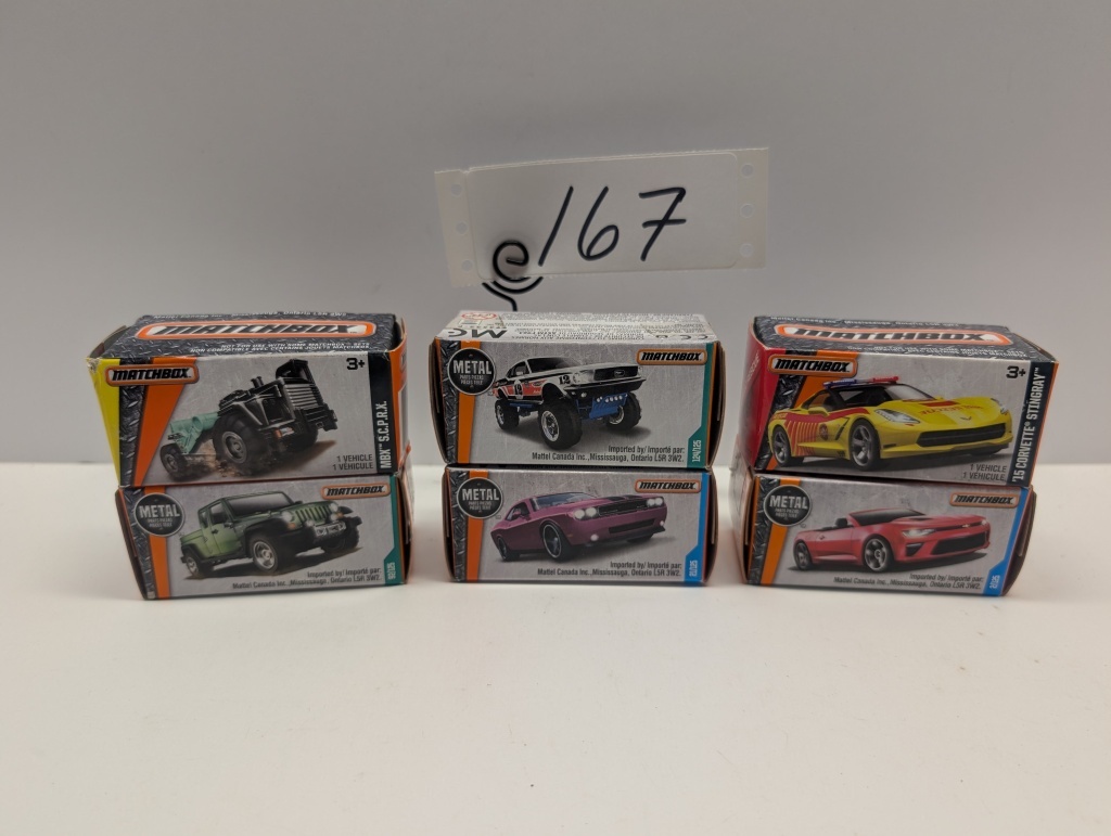 MBX SCPRX- 17 JEEP GLADIATOR- 15 CORVETTE STINGRAY- 16 CHEVY CAMARO CONVERTIBLE, METAL- DODGE CHALLENGER SRT8, METAL – 68 FORD MUSTANG, METAL- NIB- SHOWS SOME WEAR AND TEAR FROM STORAGE
