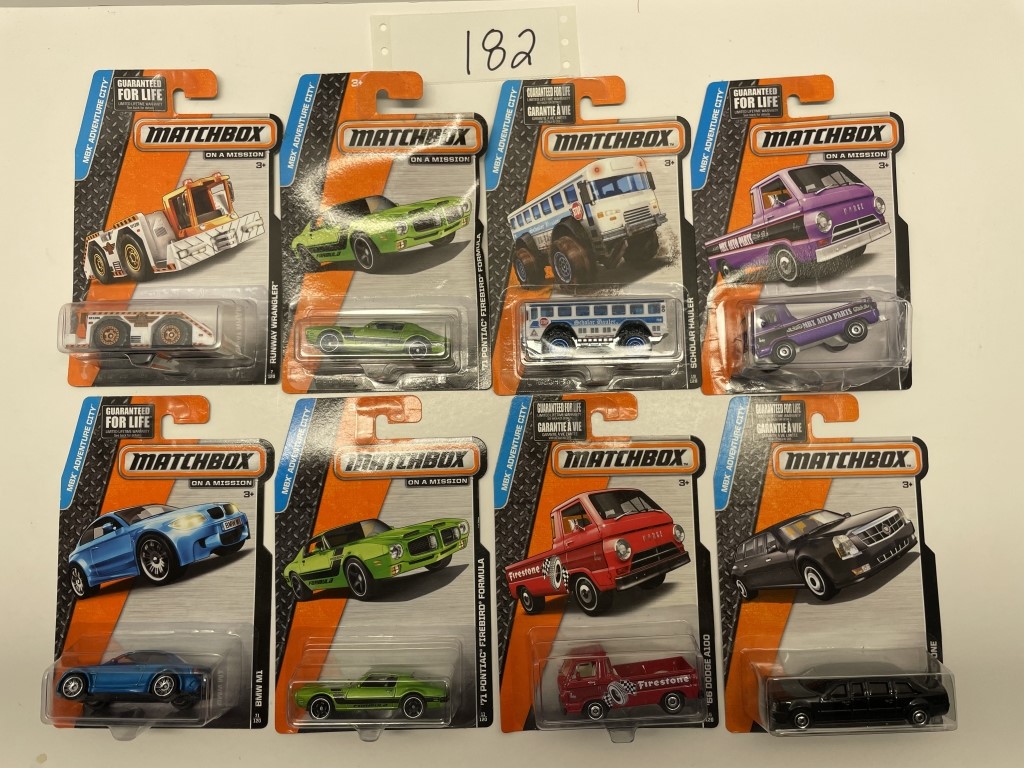 MBX ADEVENTURE CITY- BMW M1- SCHOLAR HAULER-DODGE A100- ’71 PONTIAC FIREBIRD FORMULA- ’66 DODGE A100- CADILLAC ONE- ’71 PONTIAC FIREBIRD FORMULA- RUNWAY WRANGLER- NIB- SHOWS SOME WEAR AND TEAR FROM STORAGE