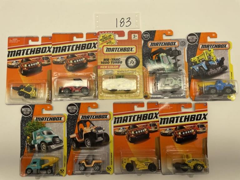 CONSTRUCTION: ROAD ROLLER- SCRAPER-SKIDSTER-TRACTOR PLOW- MB-TRAC 1600 TURBO,METAL DIECAST- METAL MBX ALL TERRAIN CRANE- METAL DRILL DIGGER- METAL FOUR X FORCE- METAL TREE LUGGER-NIB- SHOWS SOME WEAR