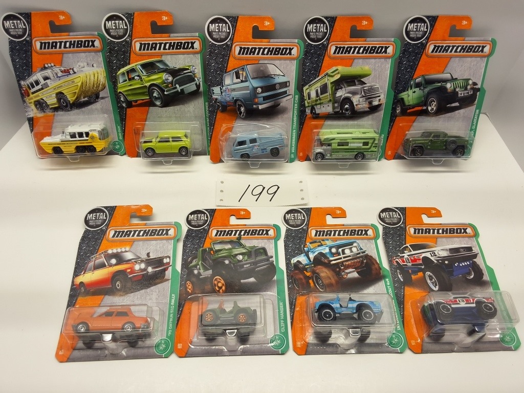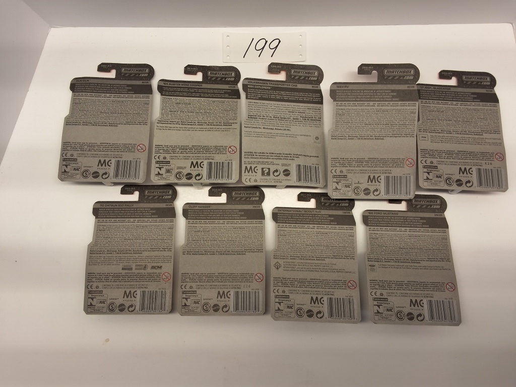 METAL PIECES- ’70 DATSUN 510 RALLY, CLIFF HANGER, INTRENATIONAL SCOUT 4X4, ’68 FORD MUSTANG, ’64 AUSTIN MINI COOPER, DUK-DUK, VOLKSWAGON TRANSPORTER CAB, MBX-RV, ’17 JEEP GLADIATOR – NIB- SHOWS SOME WEAR AND TEAR