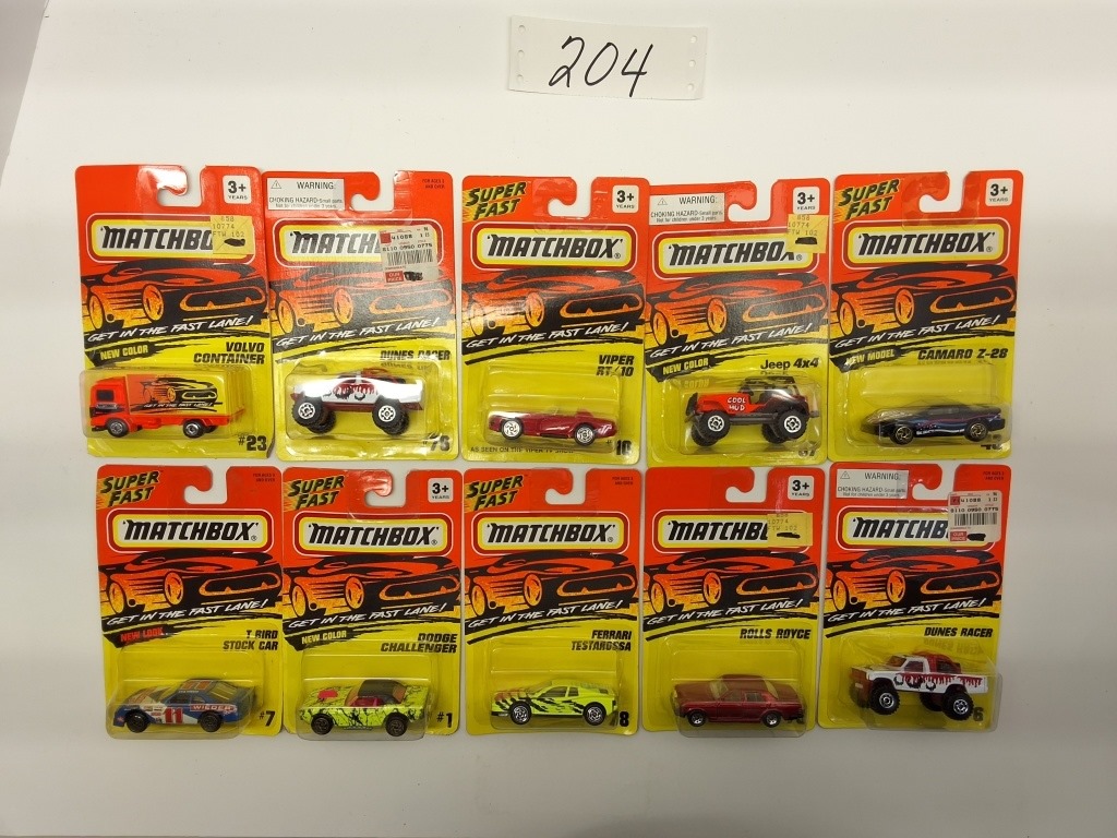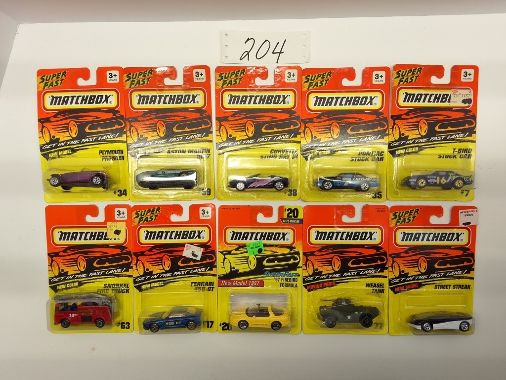 MOVING PARTS: WEASEL TANK #77, 97′ FIREBIRD FORMULA #20, SNORKEL FIRE TRUCK #63, ROLLS ROYCE #73, JEEP 4X4 #37, DUNES RACER #76 (X2), VOLVO CONTAINER #23 – SUPERFAST: VORVETTE STINGRAY III #38, ASTON MARTIN DB-7