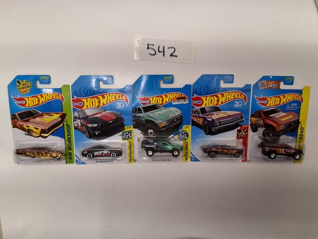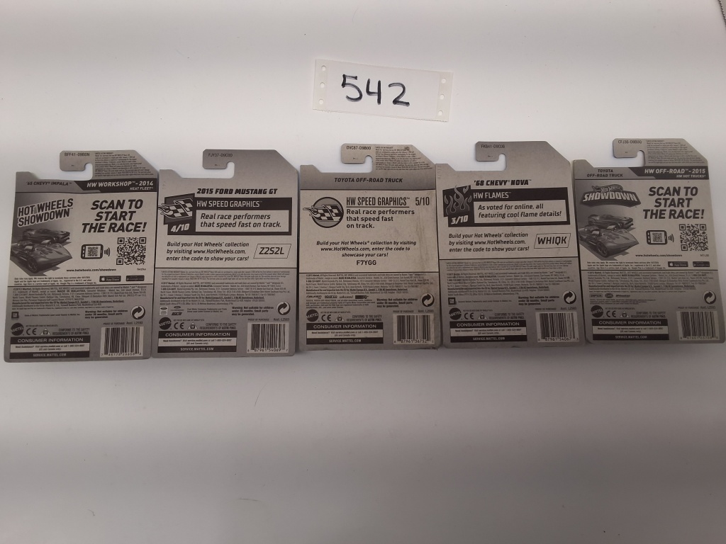 HW WORKSHOP: ’65 CHEVY IMPALA – HW SPEED GRAPHICS: 2015 FORD MUSTANG GT – HW GRAPHICS: TOYOTA OFF ROAD TRUCK – HW FLAMES: ’68 CHEVY NOVA – HW OFF ROAD: TOYOTA OFF ROAD TRUCK -NIB- SHOWS SOME WEAR AND TEAR FROM STORAGE