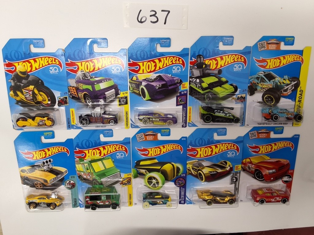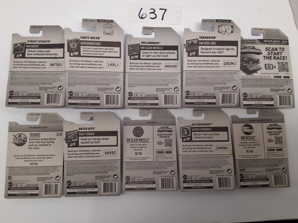 HW MOTO: STREET STEALTH- EXPERIMOTORS: CRATE RACER- HW GLOW WHEELS: HOLLOWBACK- HW RIDE ONS: TANKNATOR- HW OFF ROAD: CORKSCREW BUGGY- TOONED: ’69 CAMARO Z28- FAST FOODIE: QUICK BITE- HW GLOW WHEELS: RIP ROD- SUPER CHROMES: