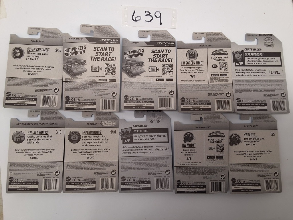 SUPER CHROMES: PHARODOX – HW CITY: POISON ARROW- HW CITY: LAFASTA- HW SCREEN TIME: GREASE ROD -EXPERIMOTORS: CRATE RACER- HW CITY WORKS: FORD TRANSIT CONNECT- EXPERIMOTORS: TOOLIGAN- HW RIDE ONS: