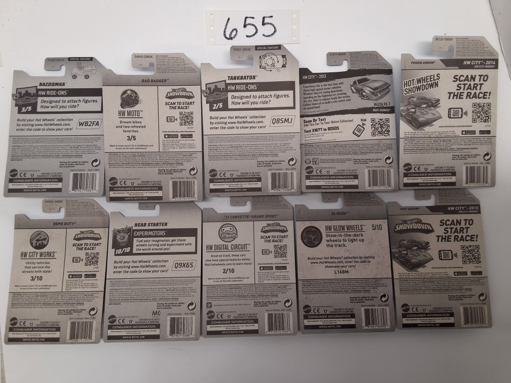 HW RIDE ONS: BAZOOMKA- HW MOTO: BAD BAGGER – HW RIDE ONS: TANKNATOR- HW CITY: MAZDA RX 7 NIGHT BURNER- HW CITY: POISON ARROW- HW CITY WORKS: REPO DUTY- EXPERIMOTORS: HEAD STARTER- HW DIGITAL CIRCUIT: ’11 CORVETTE GRAND