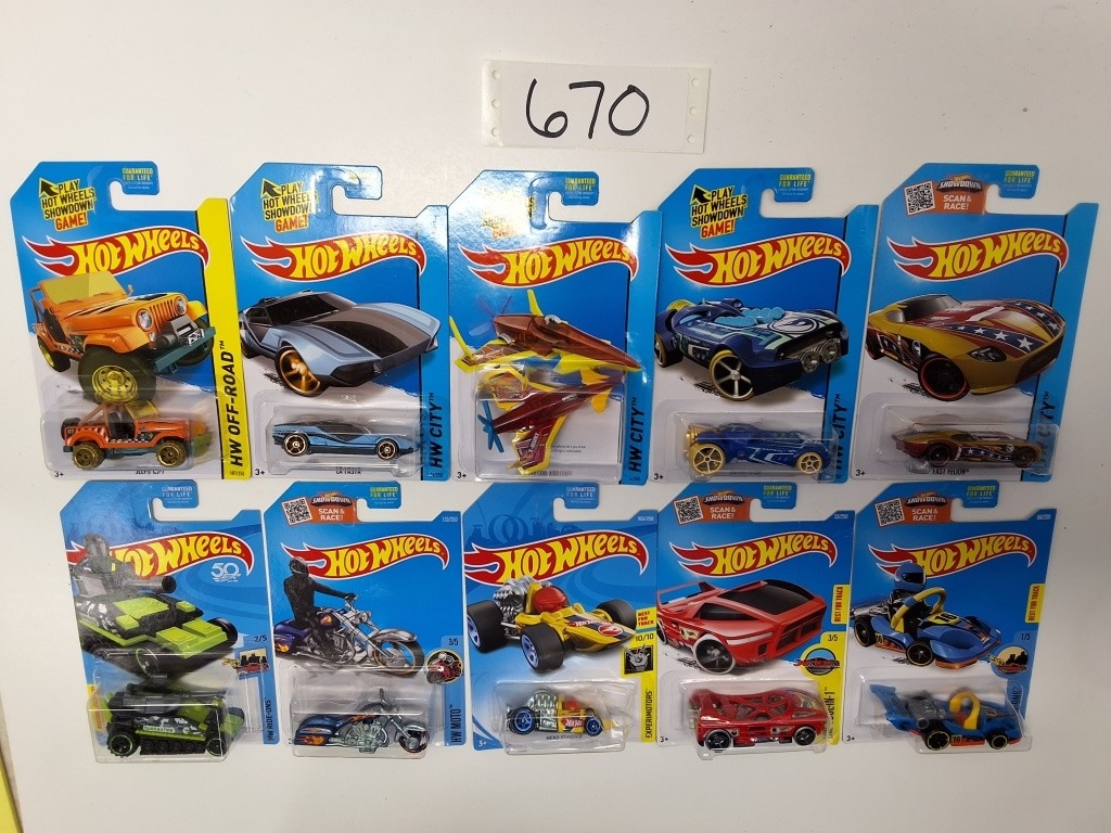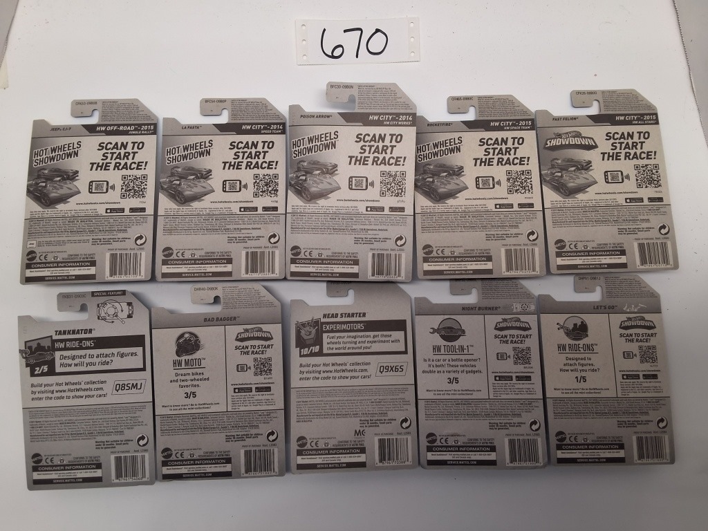 HW OFF ROAD: JEEP CJ-7 – HW CITY: LA FASTA, POISON ARROW, ROCKETFIRE, FAST FELON- HW RIDE ONS: TANKANATOR, LET’S GO- HW MOTO: BAD BAGGER- EXPERIMOTORS: HEAD STARTER- HW TOOL IN 1: NIGHT BURNER- NIB- SHOWS SOME WEAR AND