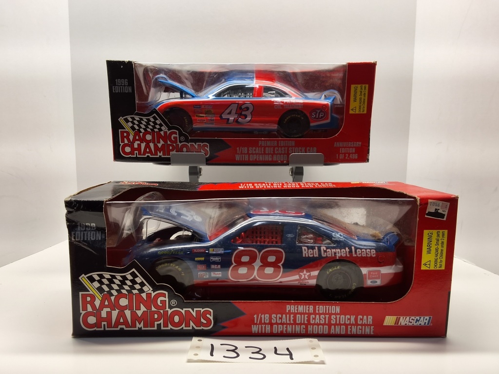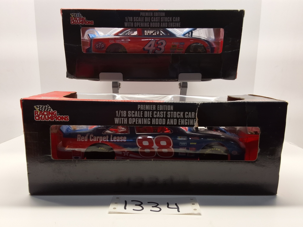 1996 EDITION - 1/18" SCALE - PREMIER EDITION DIE CAST STOCK CAR WITH OPEN HOOD AND ENGINE - # 88 & #43 - NIB - SHOWS SOME WEAR AND TEAR FROM STORAGE