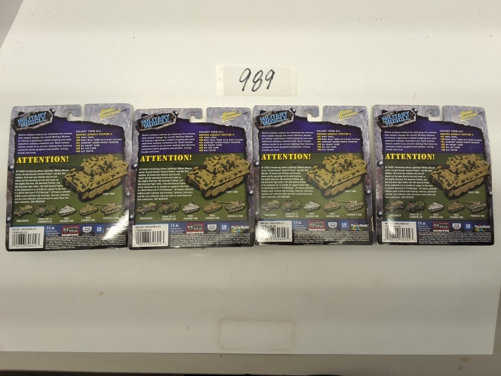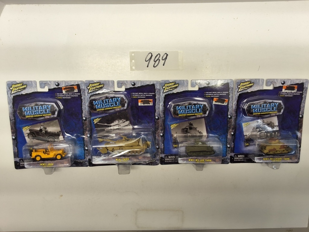 MILITARY MUSCLE GROUND ASSAULT EDITION WWII JEEP 1:64 SCALE- WW11 M3 GRANT TANK 1:100 SCALE- WWII M3 LEE TANK 1:00- M1A1 TANK 1:100 SCALE- NIB- SHOWS SOME WEAR AND TEAR FROM STORAGE