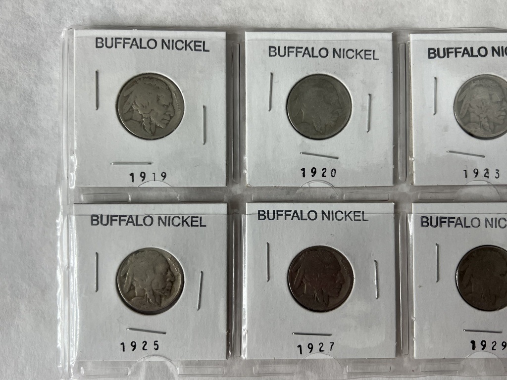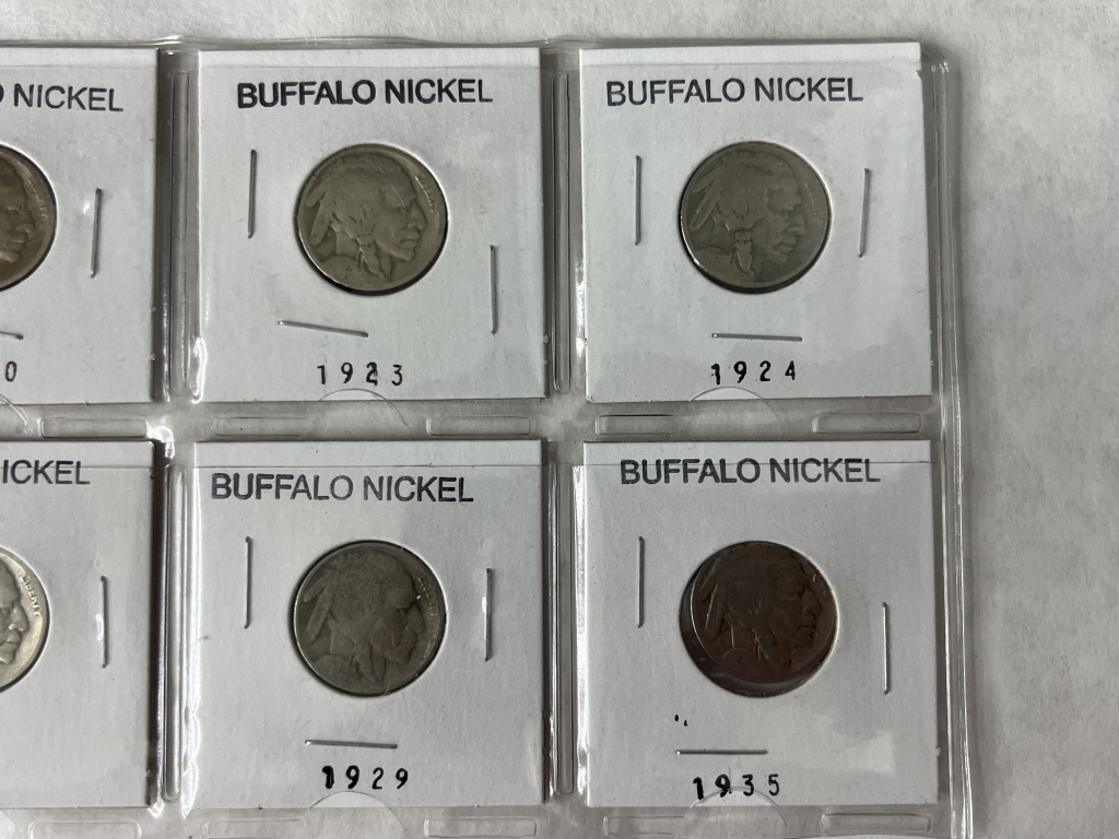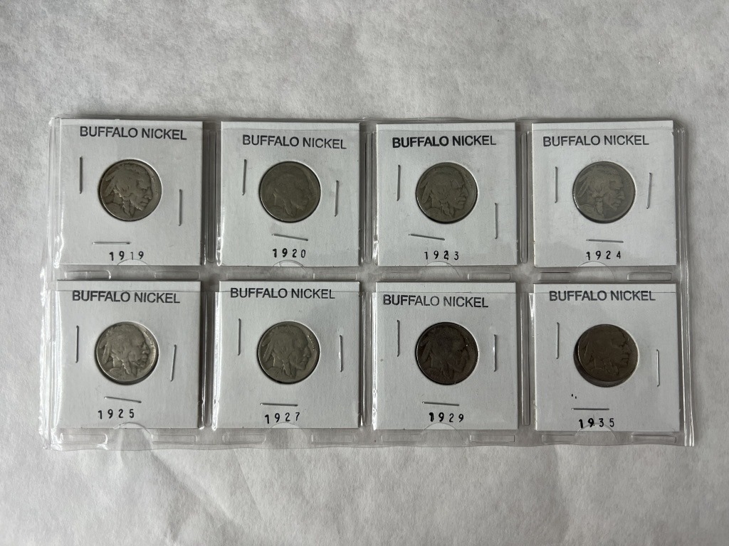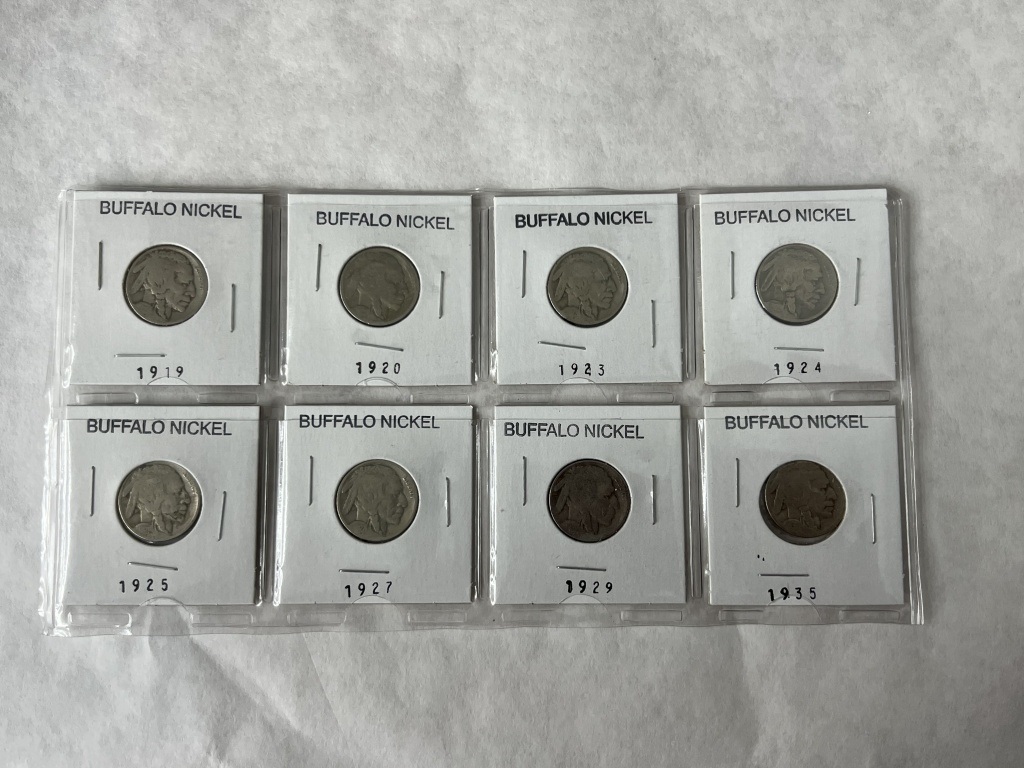 LOT OF 8 BUFFALO NICKELS INCLUDING YEARS 1919,1920,1923,1924,1925,1927,1929,1935