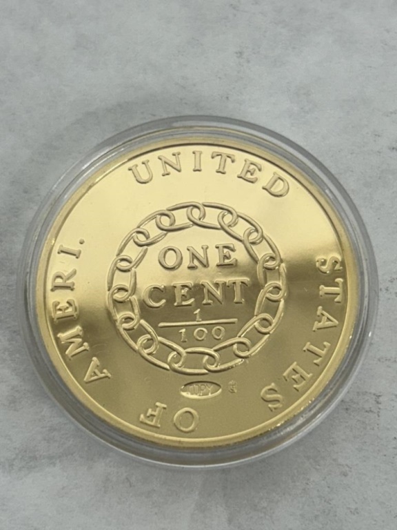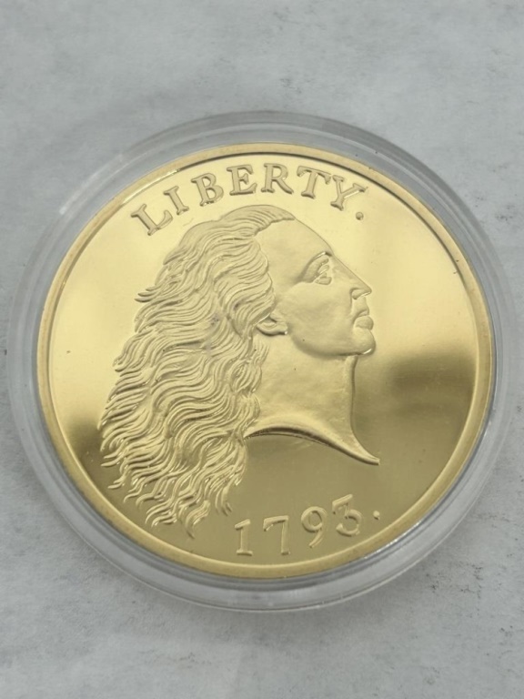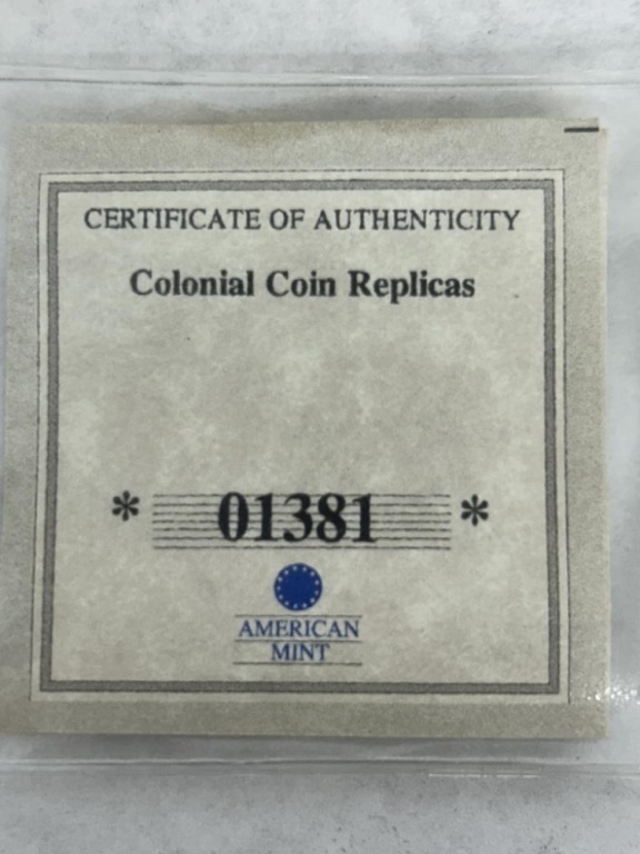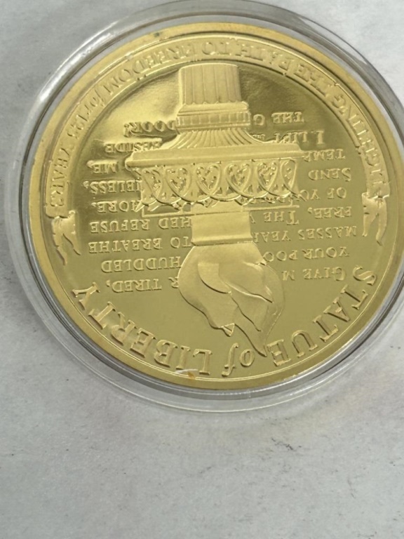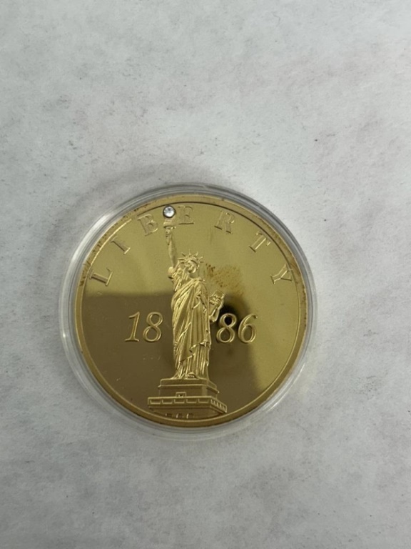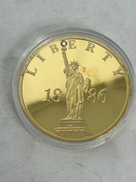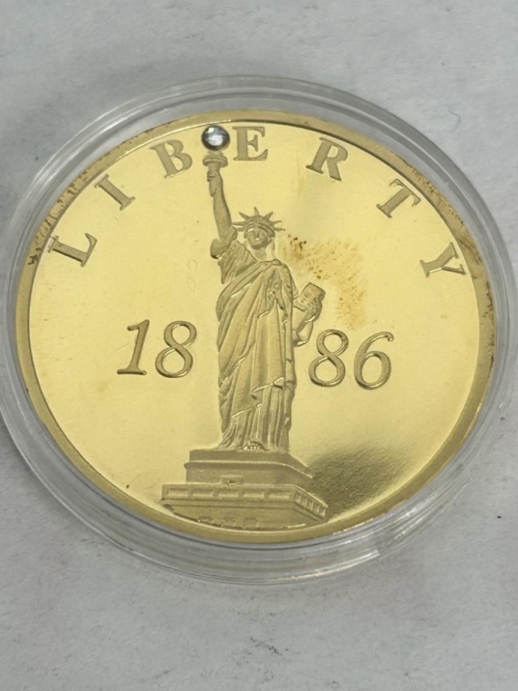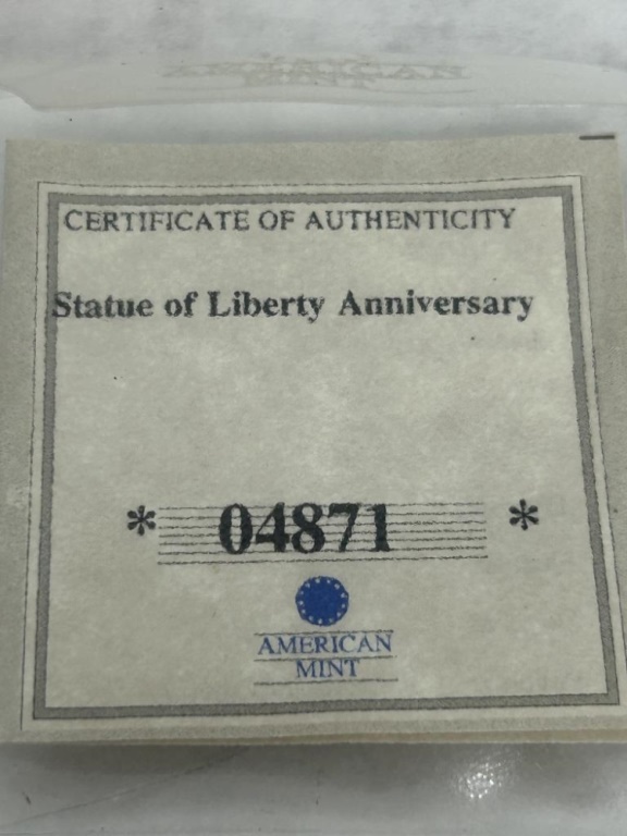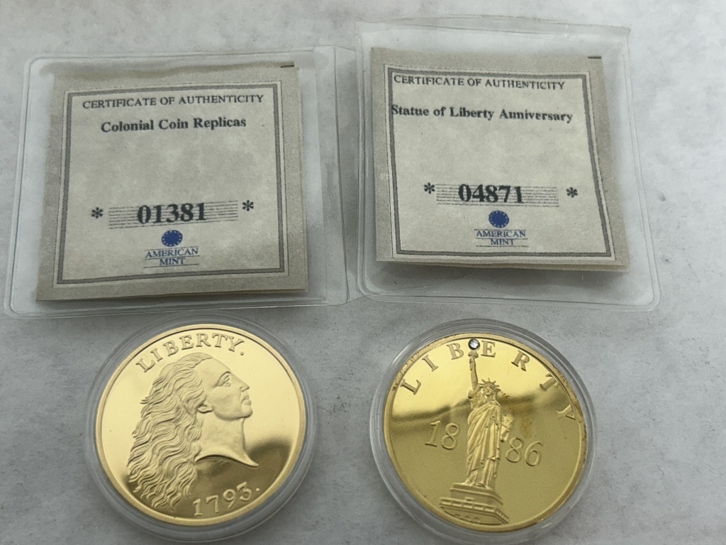 STATUE OF LIBERTY ANNIVERSARY COIN AND COLOINIAL COIN REPLICA