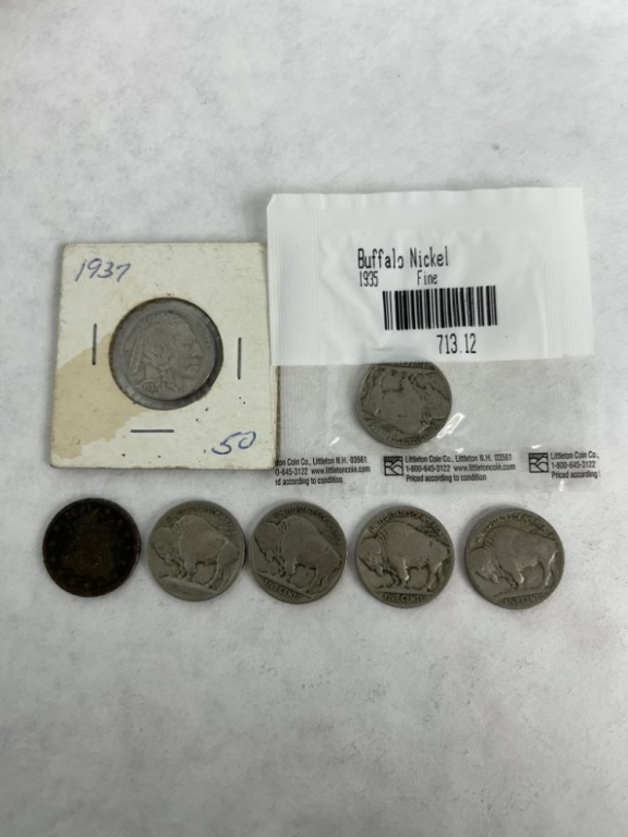 SIX BUFFALO NICKELS AND ONE V NICKEL