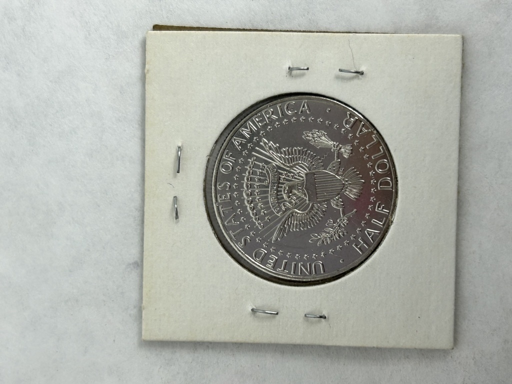 UNCIRCULATED 2003-D KENNEDY HALF DOLLAR, 2022-P KENNEDY HALF DOLLAR, PRESIDENT EISENHOWER COLLECTABLE TOKEN, 1964-S LIBERTY DIME, 2012-D NEW MEXICO QUARTER, AND GERMAN COIN