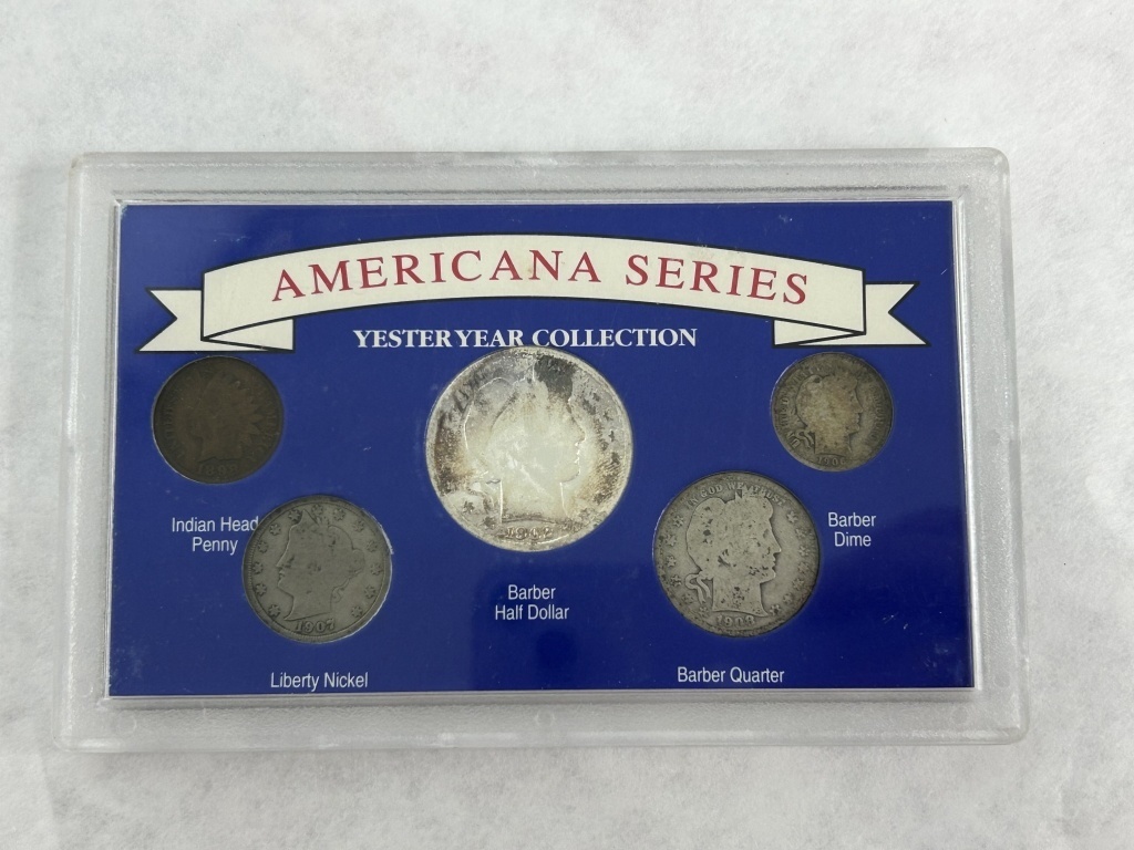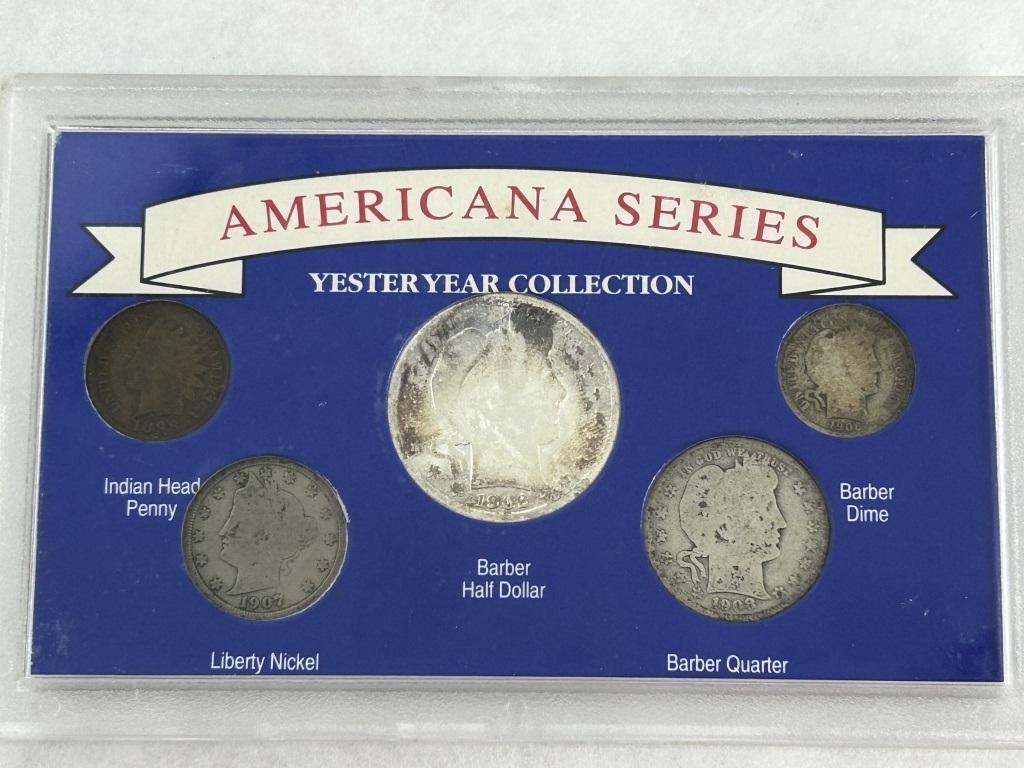 AMERICAN SERIES YESTERYEAR COLLECTION INCLUDING INDIAN HEAD PENNY, LIBERTY NICKEL, BARBER HALF DOLLAR, BARBER QUARTER, BARBER DIME