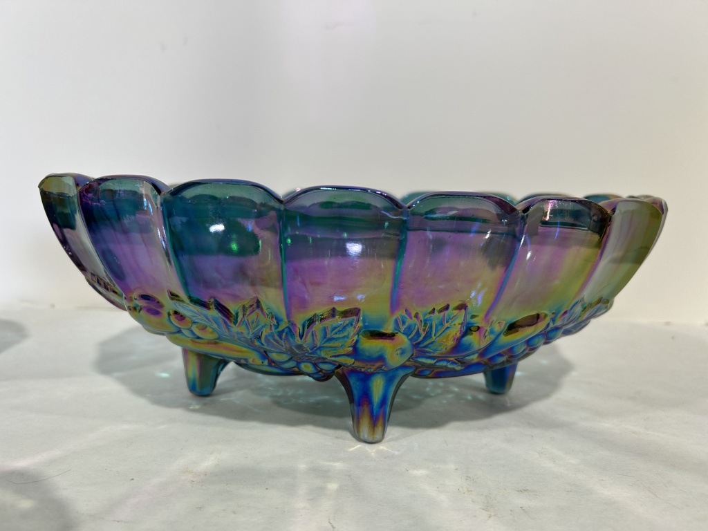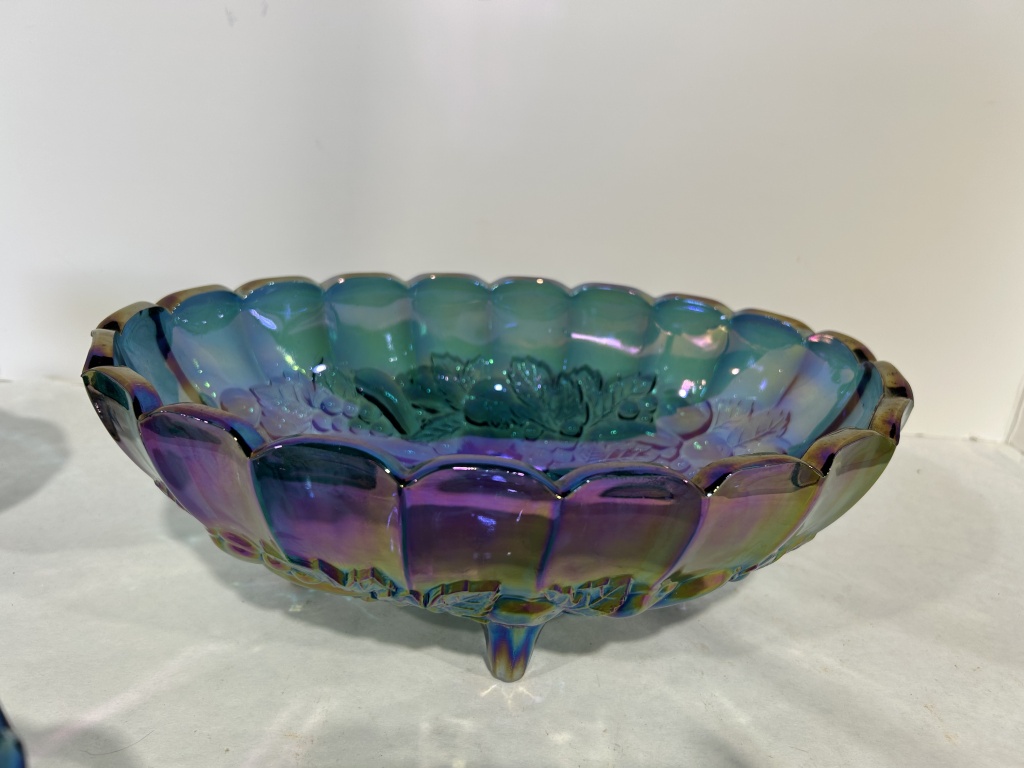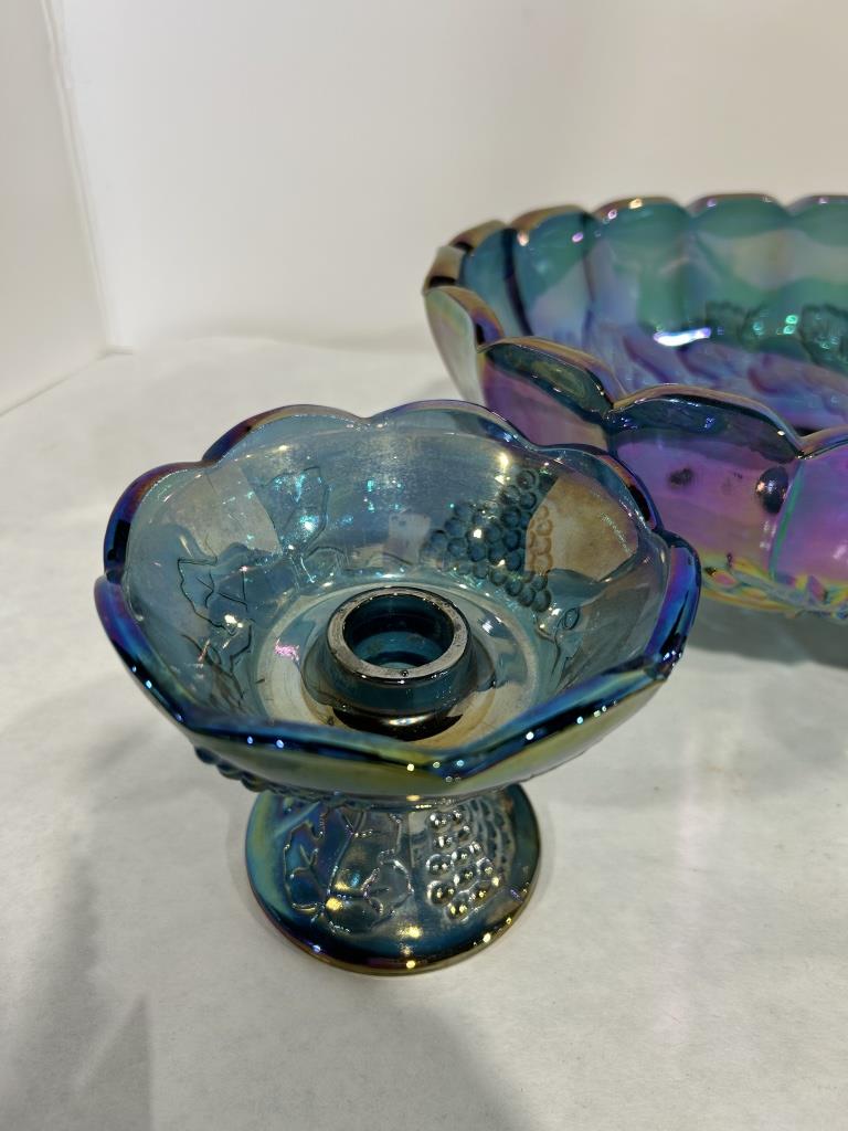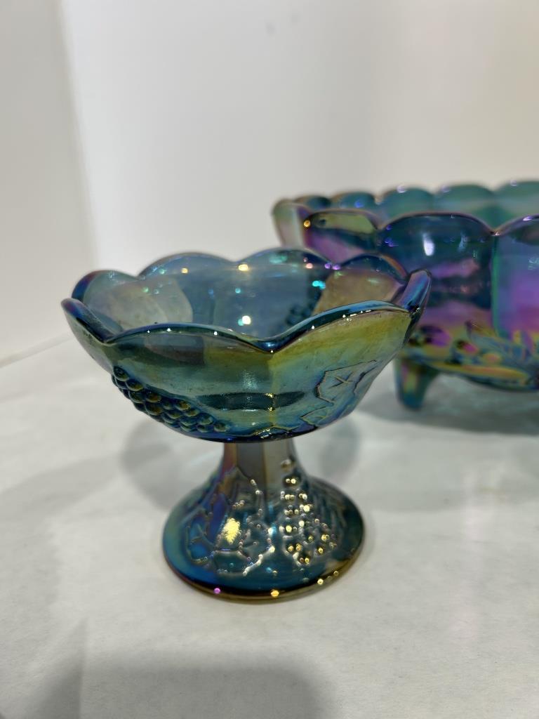 CARNIVAL IRRIDESCENT BLUE IN HARVEST GRAPE PATTERN LOT ALSO INCLUDES FOOTED OVAL FRUIT BOWL