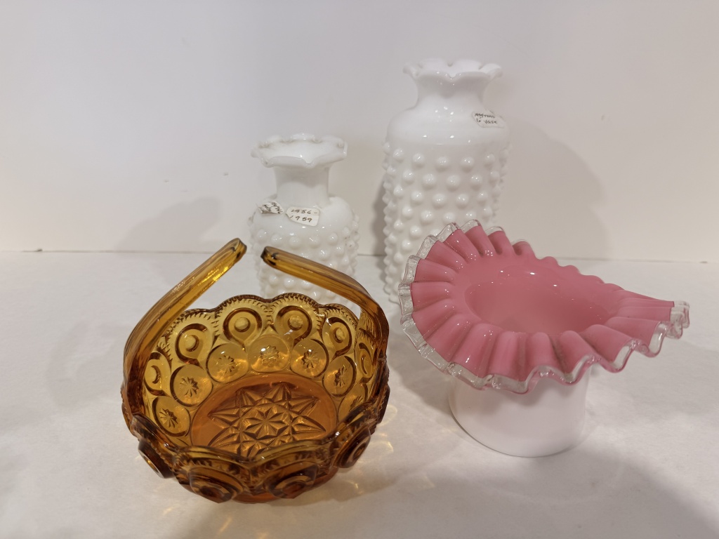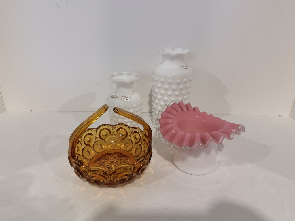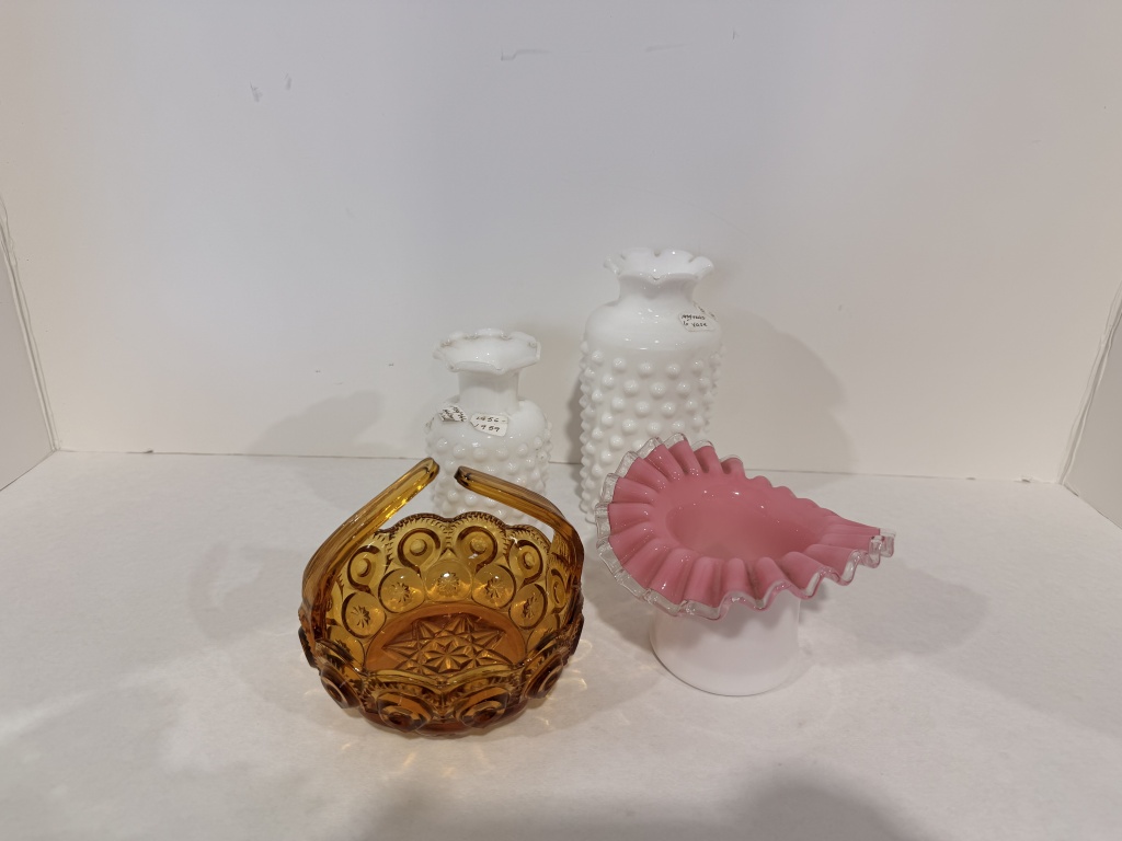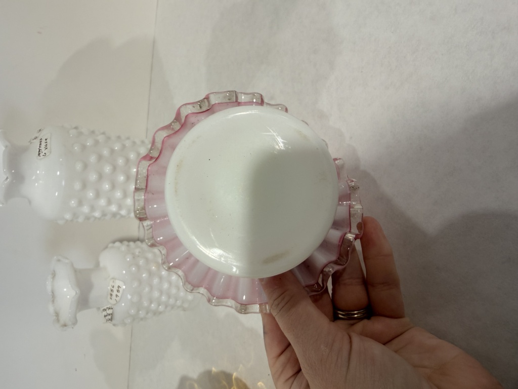 FENTON PEACH CREST RUFFLE EDGE BOWL, TWO WHITE HOBNAIL VASES.