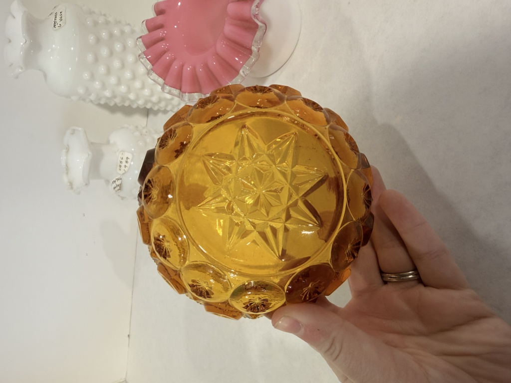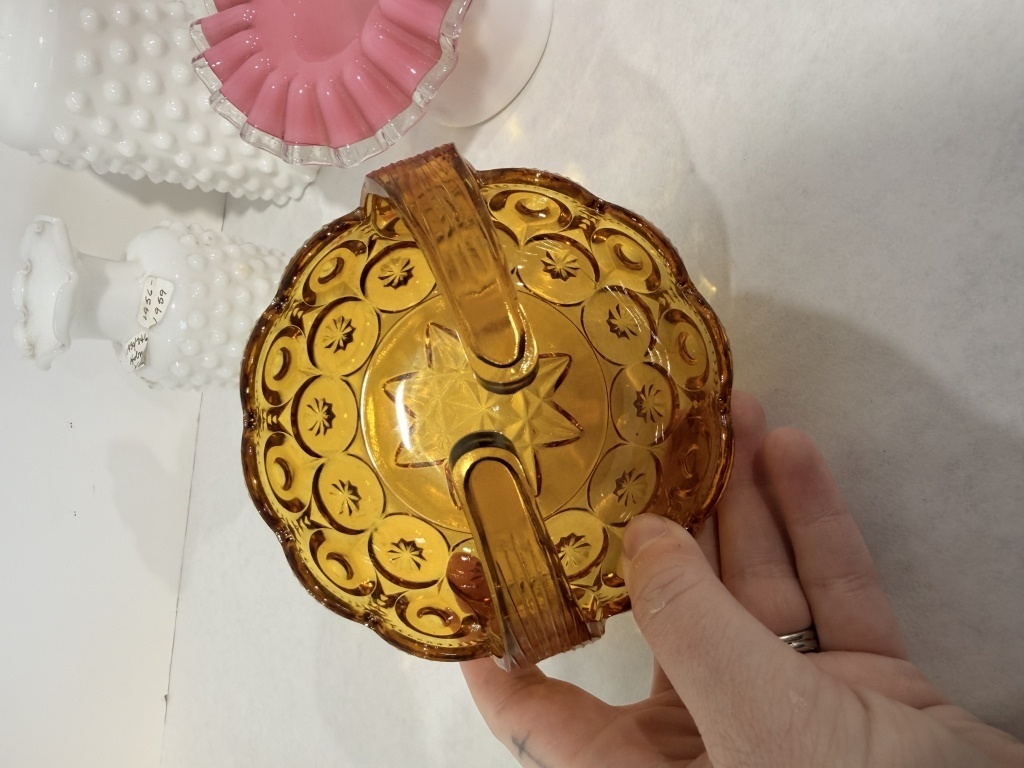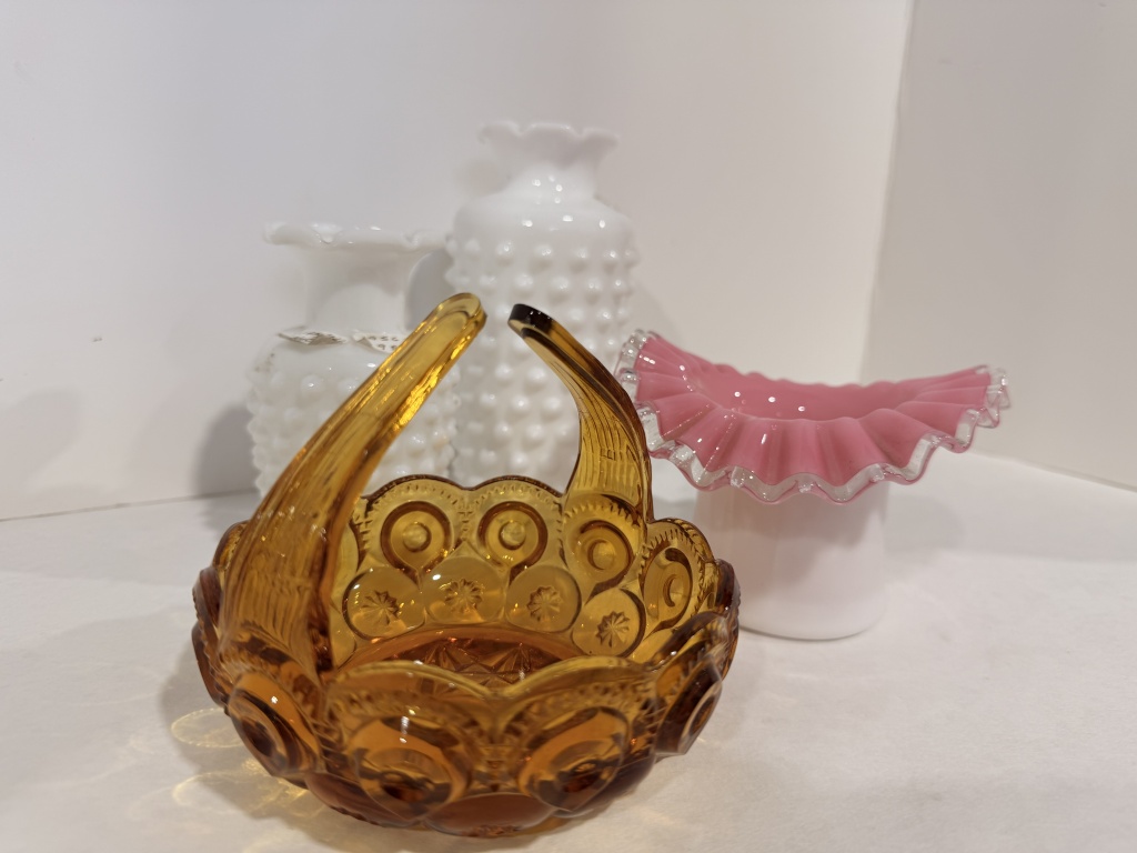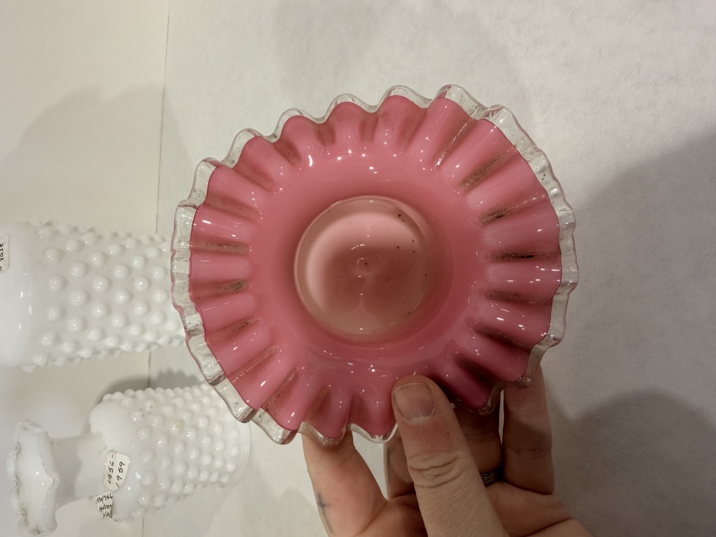 FENTON PEACH CREST RUFFLE EDGE BOWL, TWO WHITE HOBNAIL VASES.
