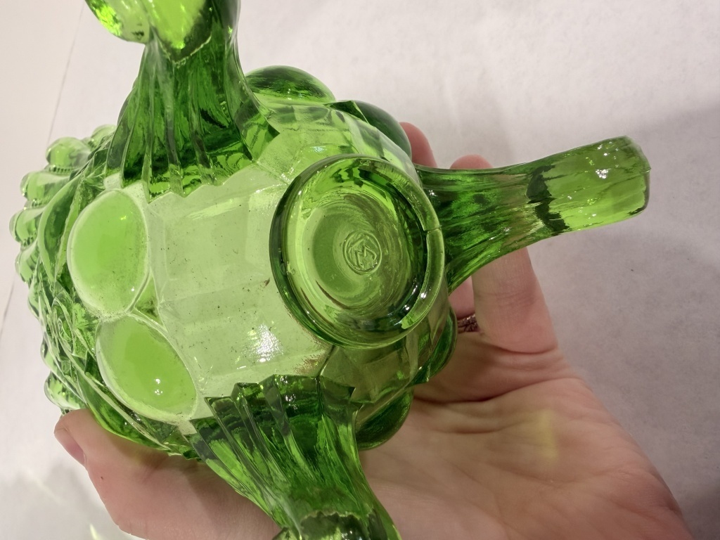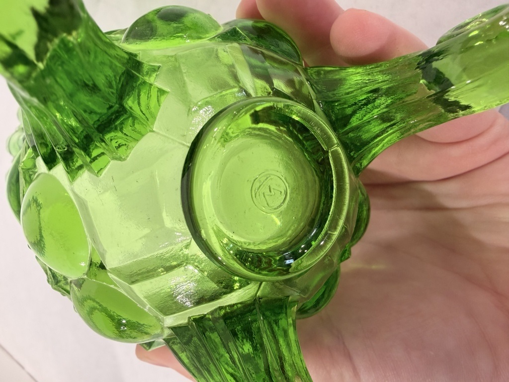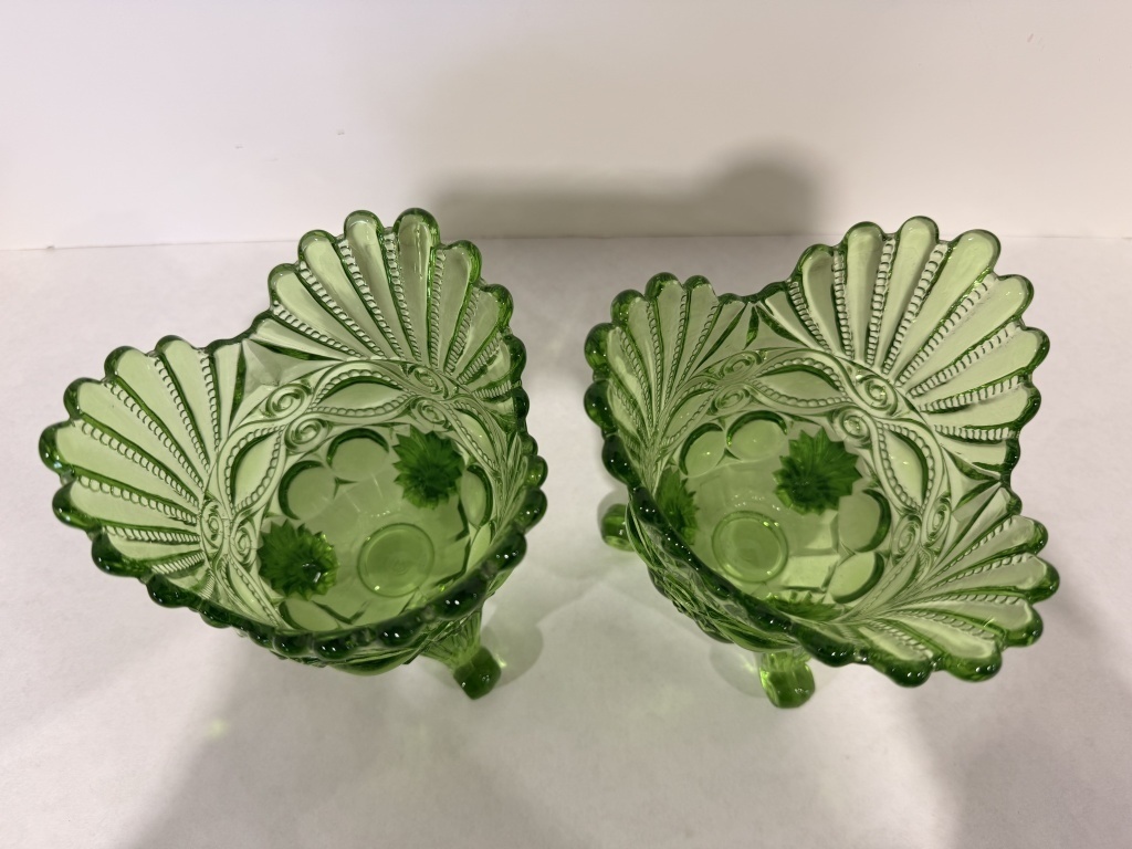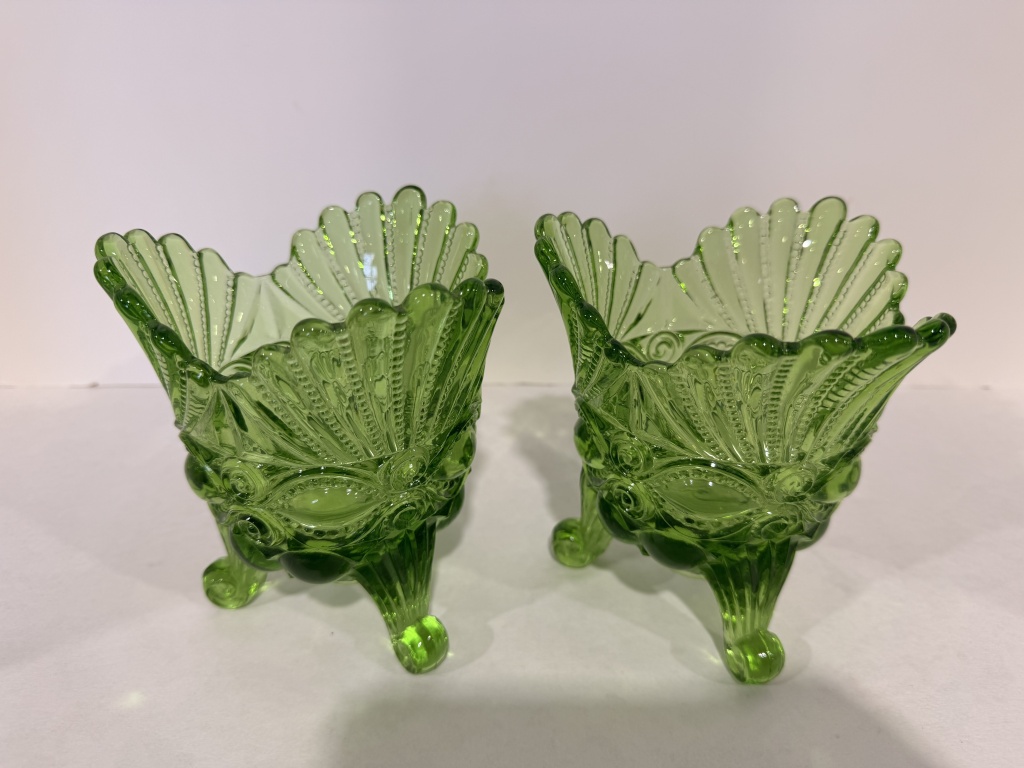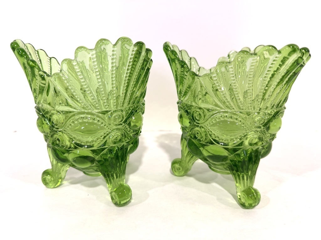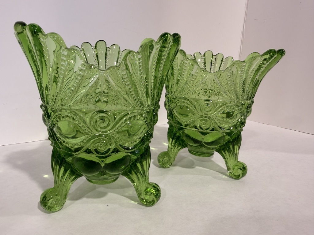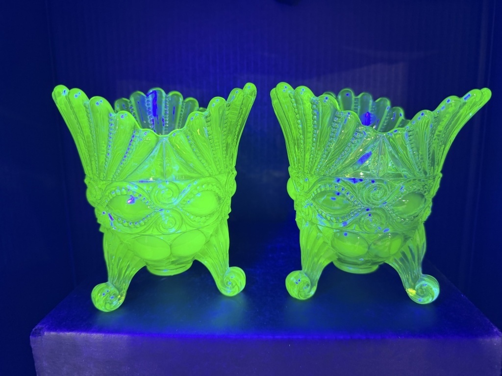 PAIR OF LARGE FOOTED SPOONERS. BELIEVE TO BE MOSSER WITH THE LOGO ON BOTTOM BUT WE ARE NOT 100% SURE. MIGHT BE AN OLD LOGO. GLOWS!
