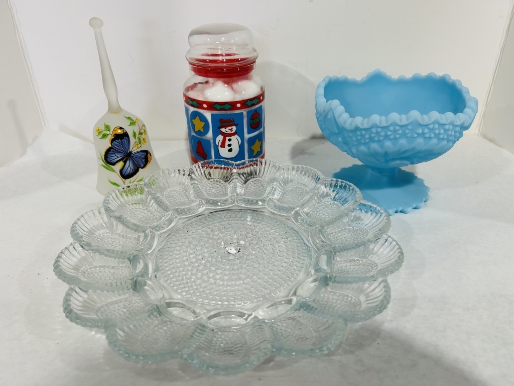 ALSO INCLUDES CLEAR DEVILED EGG TRAY, VIKING HAND-PAINTED BELL AND SNOWMAN JAR