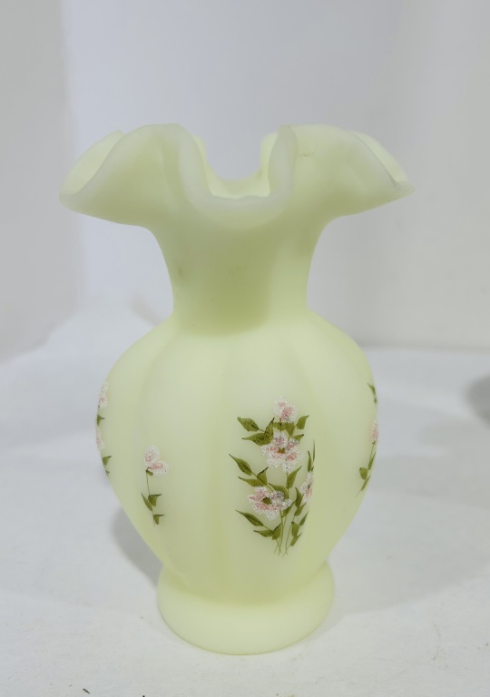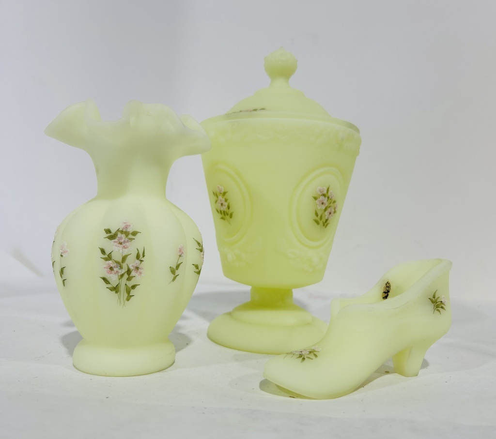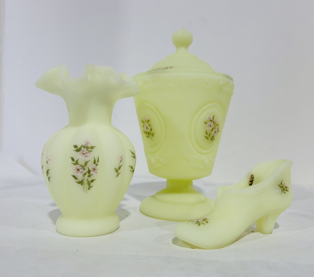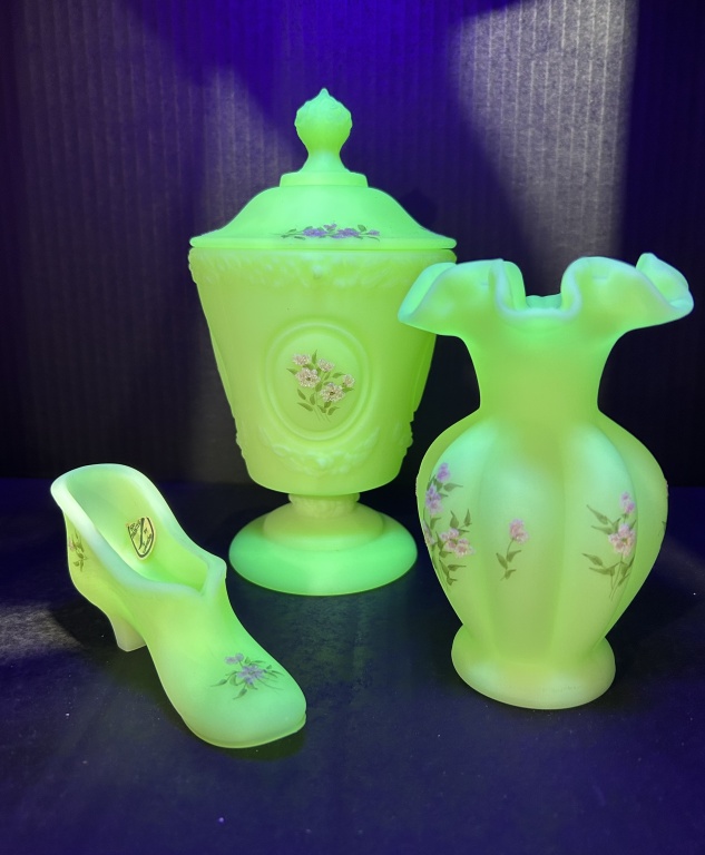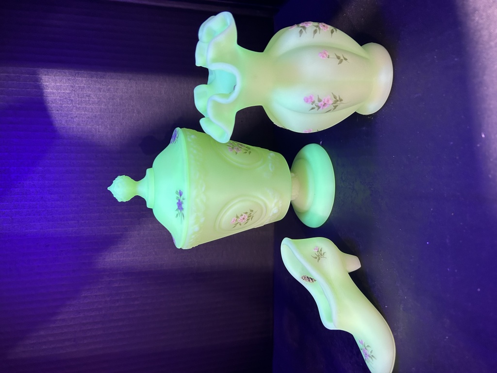 ALSO INCLUDES HAND PAINTED RUFFLED EDGE VASE AND BOOT IN FLORAL PATTERN GLOWS!