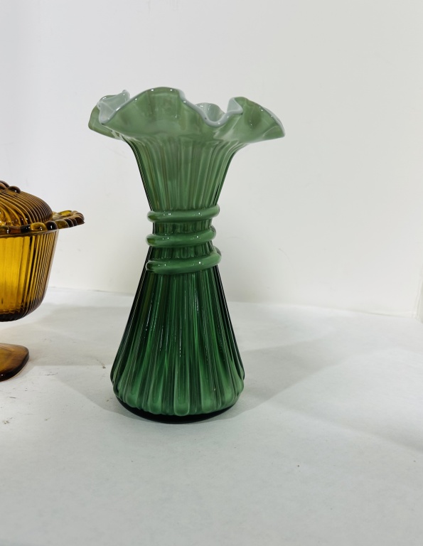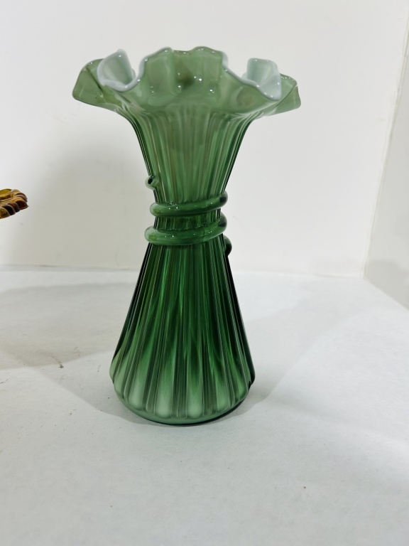 LOT ALSO INCLUDES VINTAGE GREEN FENTON VASE WITH RUFFLE TOP