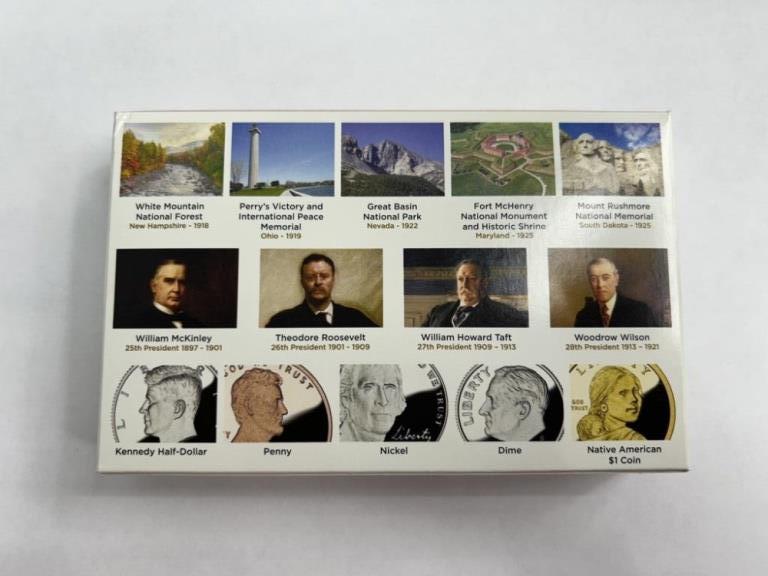 INCLUDES PRESIDENT MCKINLEY, ROOSEVELT, TAFT, AND WILSON COINS, STATE QUARTERS FOR NEW HAMSHIRE, OHIO, NEVADA, MARYLAND, AND SOUTH DAKOTA kENNEDY HALF DOLLAR, PENNY, NICKEL, DIME, AND